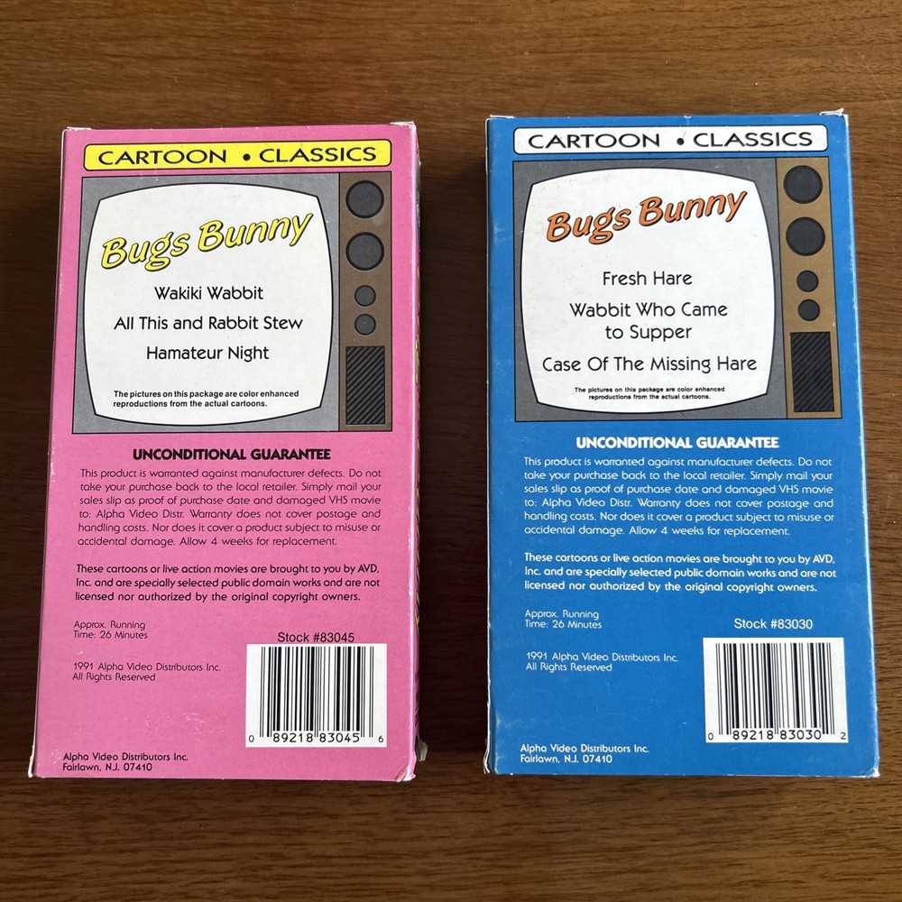 This lot includes two vintage Bugs Bunny cartoon classics VHS tapes from 1991 by Alpha Video. The tapes feature Bugs Bunny in various animated adventures, making them a great addition to any collection for fans of classic animation. The VHS tapes are in English with NTSC signal standard, suitable for Children's & Family viewing. Each tape showcases the beloved character in entertaining and nostalgic episodes that will bring joy to any viewer.