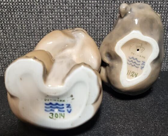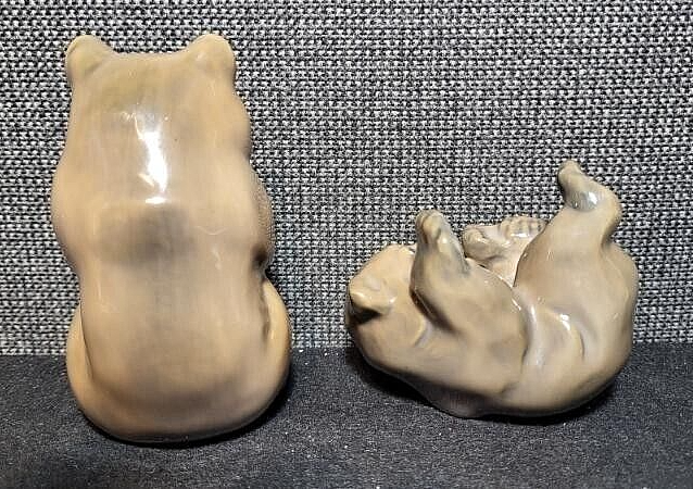 Bear Cub Rolling... # 1124. Part-caricature of a very young cub on its back, its two right limbs waving, its left pair held together. The bear's coat is mid-brown, with an overlay of gray, which is thicker at the extremities; the underpants are pale gray, the eyes are brown. This is a stable, very robust model 2.5" high and 3" long. It was taken out of production in about 1988. Bear Cub Eating... # 3015. (1939) This model shows a bear cub squatting on its haunches, its forefeet held to its mouth, as if it is eating. That is whole attention is concentrated on the task (in hand) is evident from the deep furrows on its brow. Some 3.5" high on a small base, it has no fragile parts and was produced until about 1988.