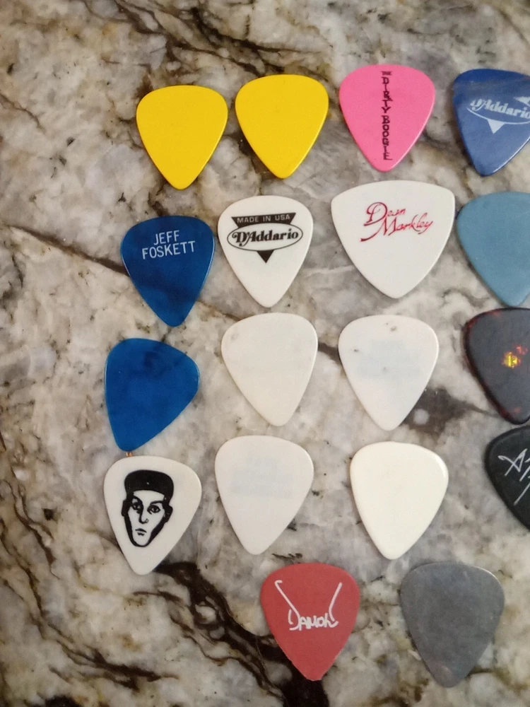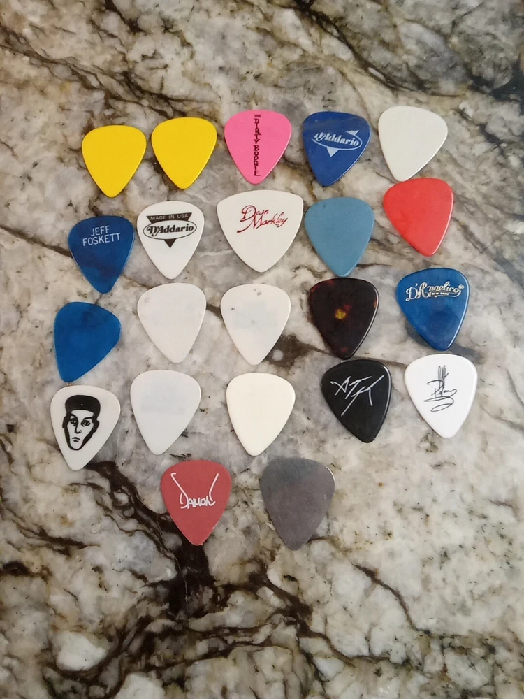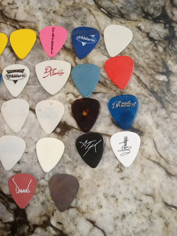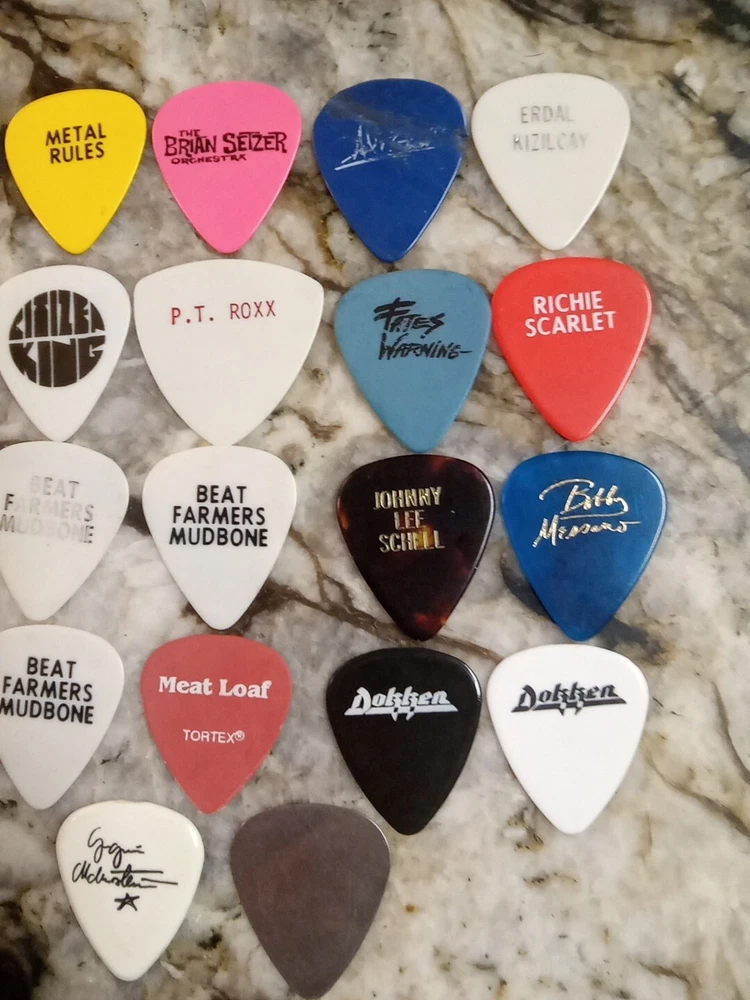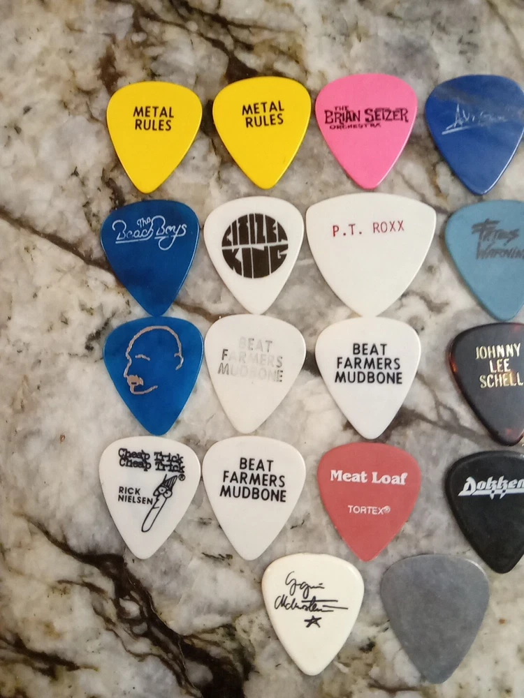 This lot of 22 vintage guitar picks includes a variety of colors and materials, making them suitable for a range of guitar types such as acoustic, lap & pedal steel, acoustic electric, bass, and electric. Whether you're a collector or a musician, these picks are a great addition to your collection. The lot features picks with unique designs, including the Brian Seltzer Orchestra Meatloaf Metal Rules pick.