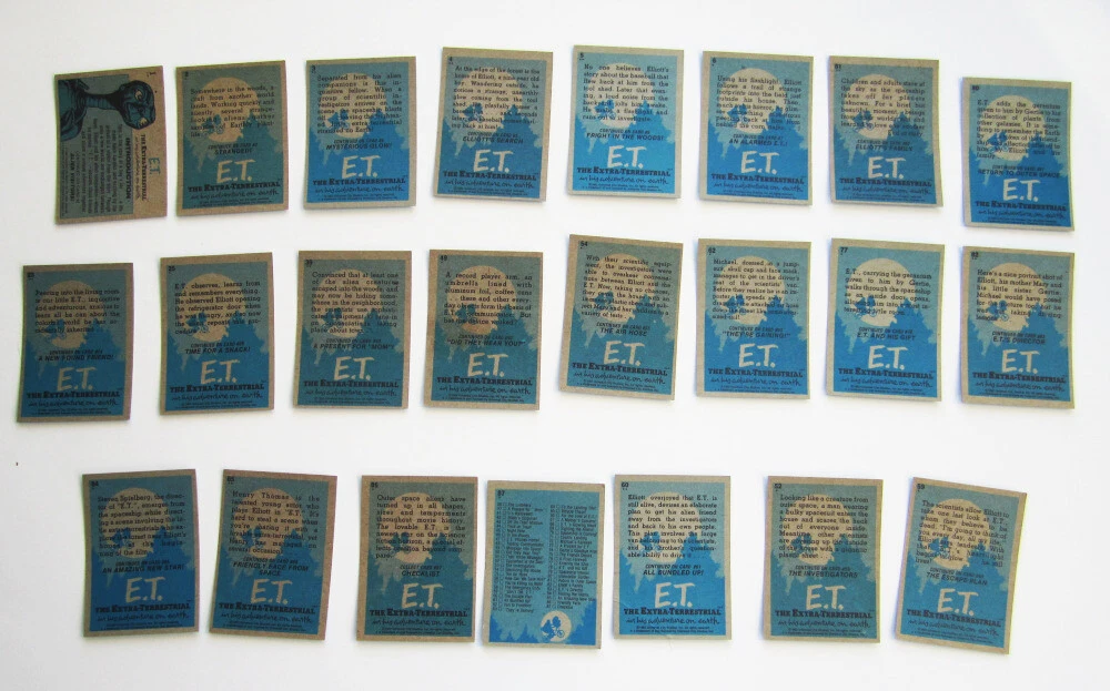 Lot of 23 original 1982 "ET The Extraterrestrial" movie bubblegum trading cards in varying condition, mostly excellent. These measure 3.5" x 2.5", regular-sized trading cards, genuine vintage. CONDITION: Actual items are shown. All are used but mostly in great shape, a few may have minor dings or minor creasing. Sold as is. PACKAGING: This set will ship carefully packed inside a small box. Feel free to ask questions if you have them - we offer discounts on multiple purchases! GRADING: We grade our trading cards and collectible sticker cards according to the eBay Sports Card Buying Guide, which can be found by clicking/tapping here . RETURNS: Accepted if item is still in the condition we sent it in. We do not accept items that have been used and/or altered by the buyer. CLICK OR TAP HERE TO SEE ALL THE VINTAGE AND NEW TRADING CARDS AND COLLECTIBLE STICKERS IN OUR EBAY STORE! LOTS of vintage sports cards (1950s-1980s), 1980s Garbage Pail Kids, vintage Pokemon and more! CLICK OR TAP HERE to visit our eBay Store and save on shipping with ONE INTERNET STOP! With over 1500 different items to choose from, we have something for every kid on your list (even the big ones)! Buy with confidence from us -- we have over 20 years experience selling on eBay and other venues!