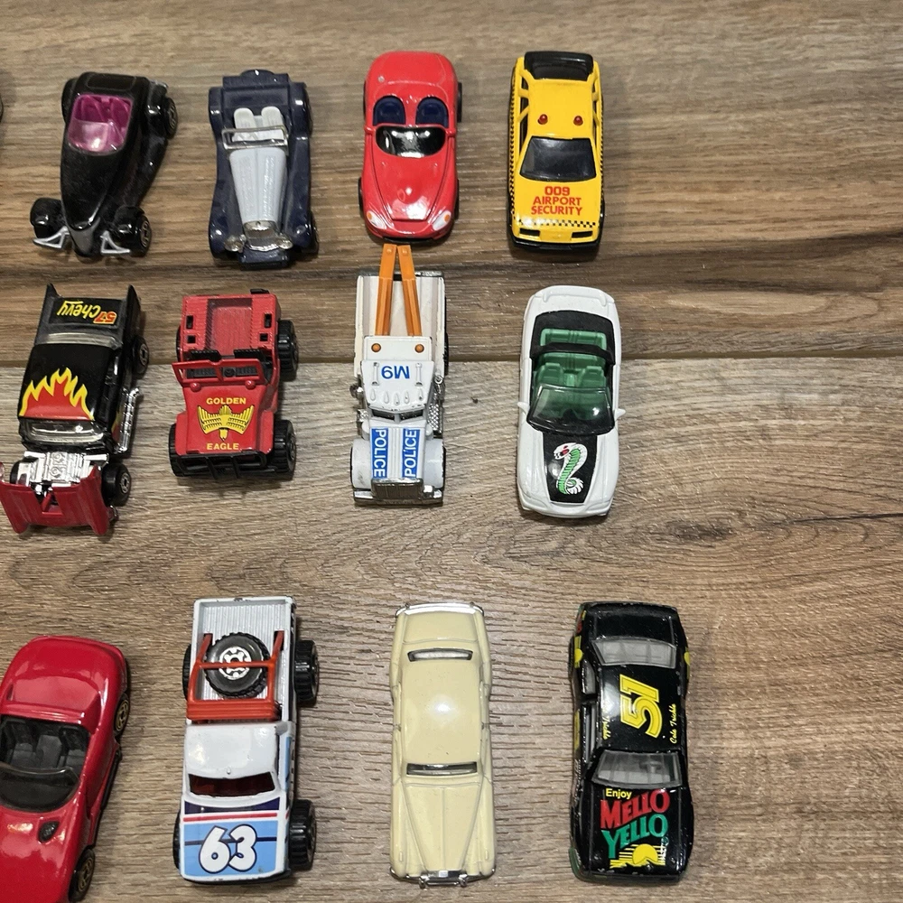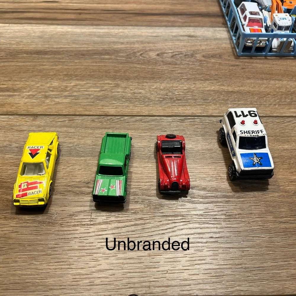 They are in used condition. Have definitely been played with and are a little bit beat up. The lot of mostly made up of matchbox cars, but there are a few hot wheels and few other unbranded ones mixed in. I think the cars are mostly from the late 80s early 90s but there are a few from the 70s mixed in. Please see pictures for specifics. Let me know if you have any other questions or want more pictures and I'd be happy to help. Thanks for checking out my item!