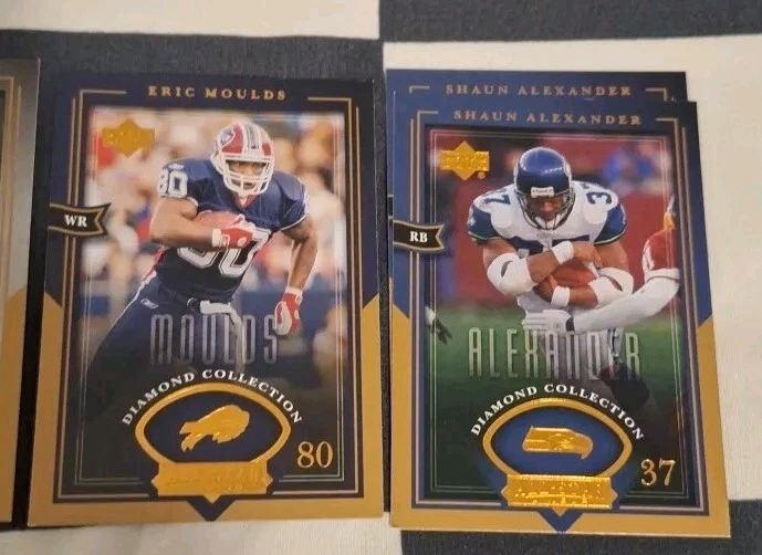 This lot of 10 sports trading cards is a great addition to any collector's collection. The cards are from the 2004 Upper Deck Diamond Collection and feature NFL players and teams. With some doubles in the lot, you'll be able to add a few extra cards to your collection. The cards are in great shape and ready for display or storage. Don't miss out on this opportunity to expand your sports trading card collection!