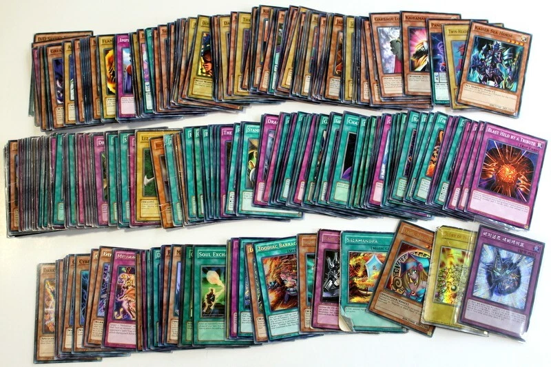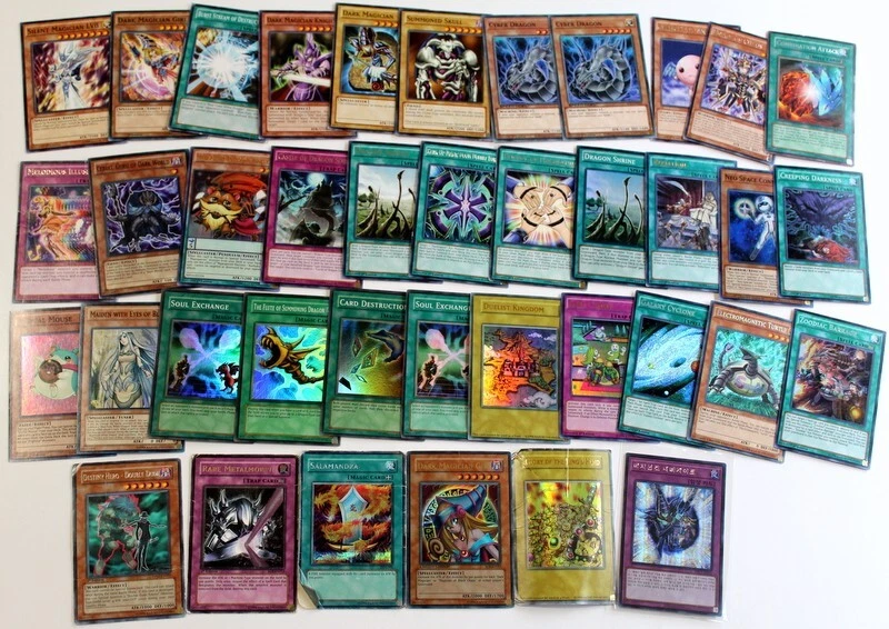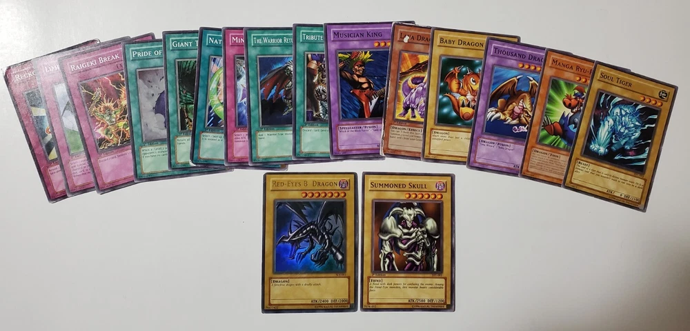 Lot of 285+ Yugioh Cards, Summond Skull, Cyber Dragon, Dark Magician, Dark Magician Girl, Red Eyes Black Dragon, Baby Dragon, Elemental Hero Neos CT03-EN001 Limited Edition Secret Rare. Condition ranges from lightly played to damaged, many of the cards are damaged.