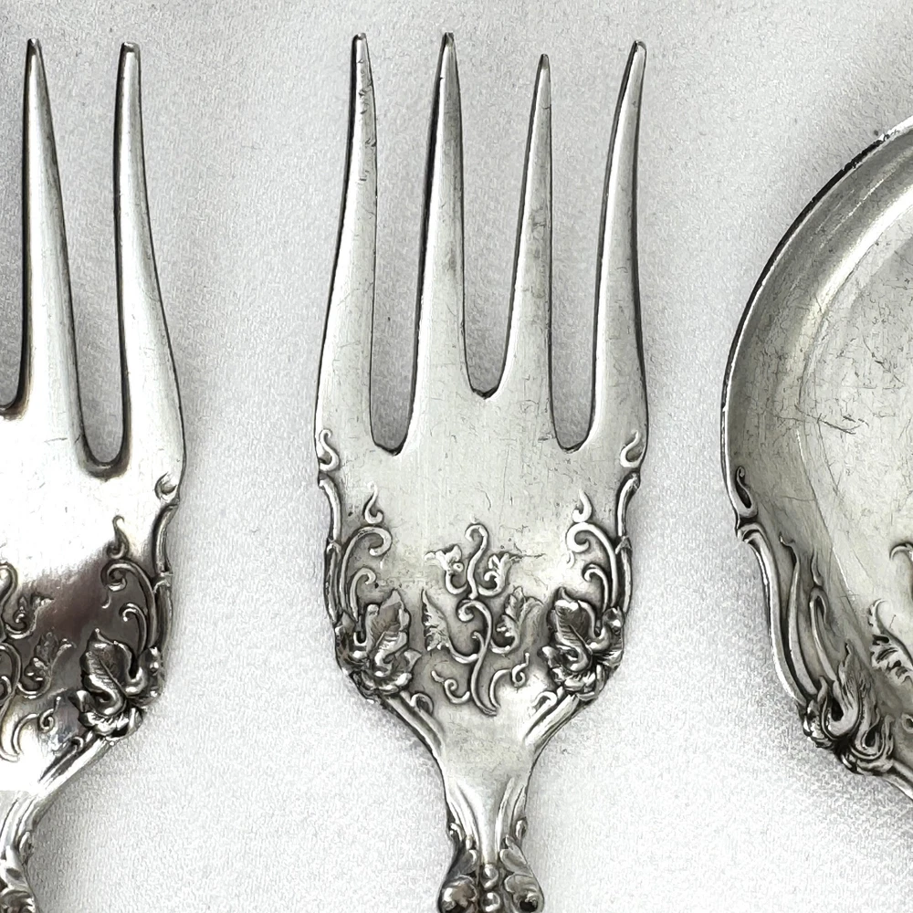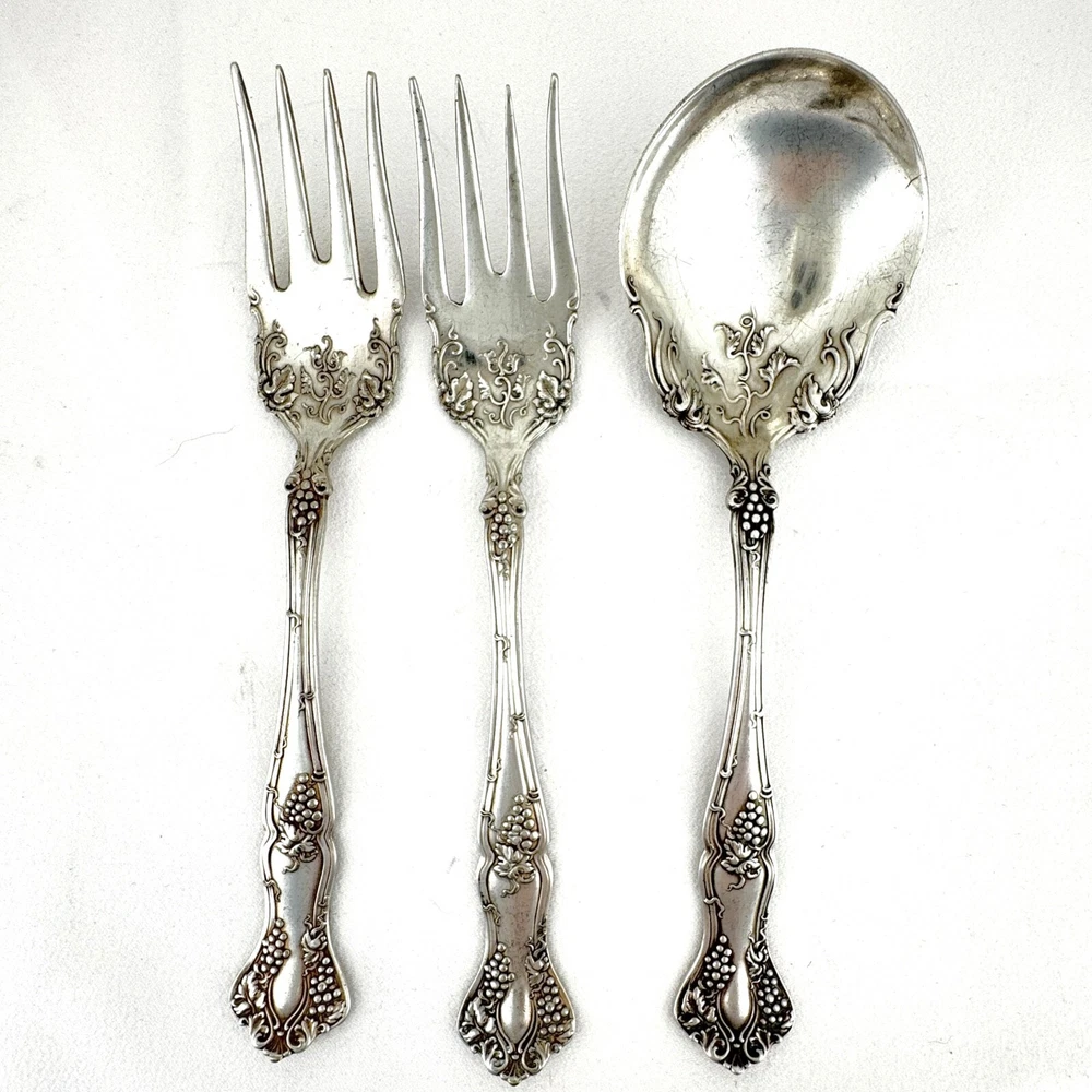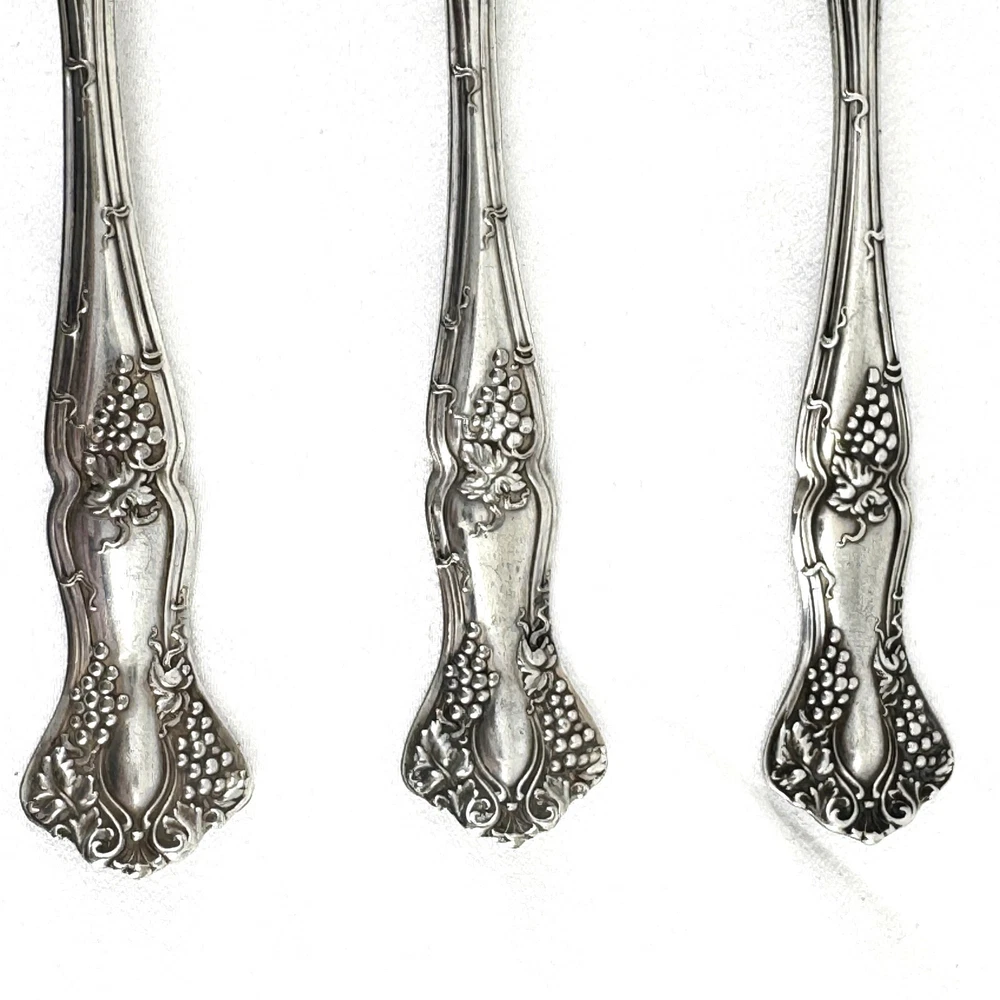 Offering a lot of 3 Vintage by 1847 Rogers Bros. impressed backstamp Triple XS. One sugar spoon 5 7/8” and two salad forks 5 7/8” silver plated in their Grapes design. Good condition, no bends, dents, or disposal damage. One fork has one tine that is shorter than the rest. There are scratches consistent with normal wear. Please view the photos for details and condition. Measurements and photo colors are approximate. For extra protection they will be packed in plastic sleeves and shipped in a box. Shipping is your choice of USPS Ground Advantage or USPS Priority at the rate determined by eBay. Terms of Sale: Photos are of the actual item you will receive and sold "as is". Placing an order is your agreement that you know what you are buying, have viewed the photos and find the condition acceptable. If you have any questions or concerns about your order, contact me through eBay Messages. Please inspect your item upon arrival and contact me if there are any problems so we may work out a solution, before you leave feedback or request a refund. No returns please.