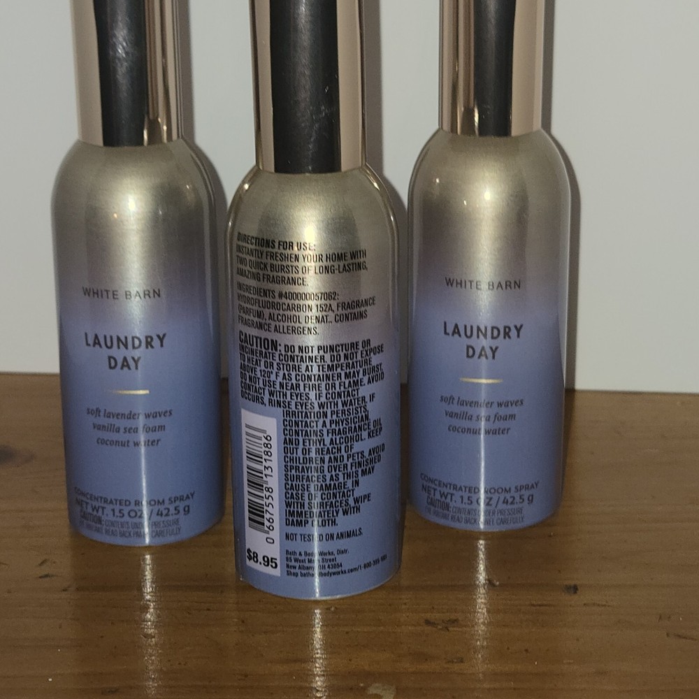 This is a set of three concentrated room sprays from Bath & Body Works in the scent "LAUNDRY DAY." Each spray is 1.5oz and suitable for use in cars and toilets. The spray is designed as an odor eliminator and comes in a clear bottle with a spray nozzle. It is manufactured by Bath and Body Works in 2023 and is part of their Home Fragrance product line.