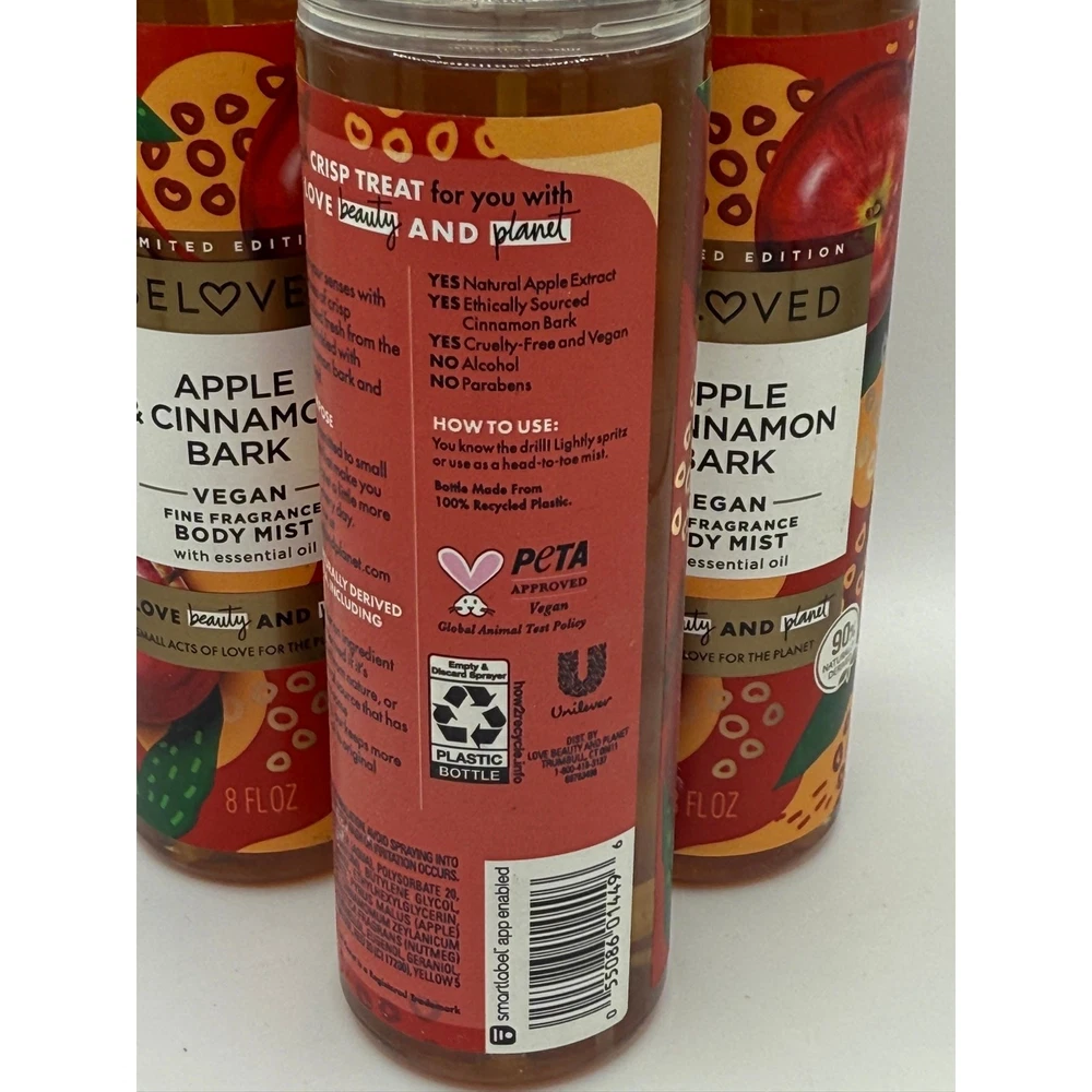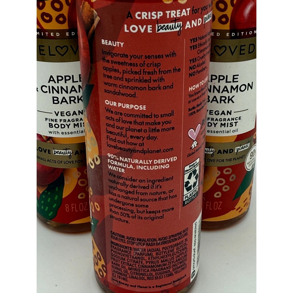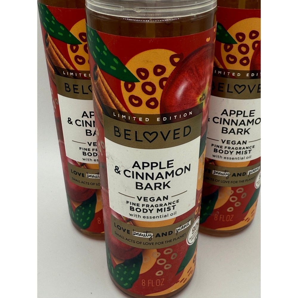 Lot of 3 Beloved Limited Edition Apple & Cinnamon Bark Fragrance Body Mist 8oz Description: Fine fragrance body mist DELIGHTS THE SENSES. Just a quick spritz LIGHTLY HYDRATES and leaves skin feeling INSTANTLY REFRESHED. 92% NATURALLY DERIVED body mist formula, infused with ESSENTIAL OILS. A body spray with an ALCOHOL-FREE formula. Invigorate the senses with the crisp, sweet fragrance of APPLE u0026 CINNAMON BARK body mist spray, bringing you warm comfort. VEGAN, PETA CERTIFIED CRUELTY-FREE, scents infused with ETHICALLY SOURCED oils and extracts. Body mist packaged in bottles made of 100% RECYCLED PLASTIC. A small act of love for you and the planet. As a part of the Beloved by Love Beauty and Planet Apple u0026 Cinnamon Bark bath and body collection, this body spray is an ideal gift to give or treat yourself.