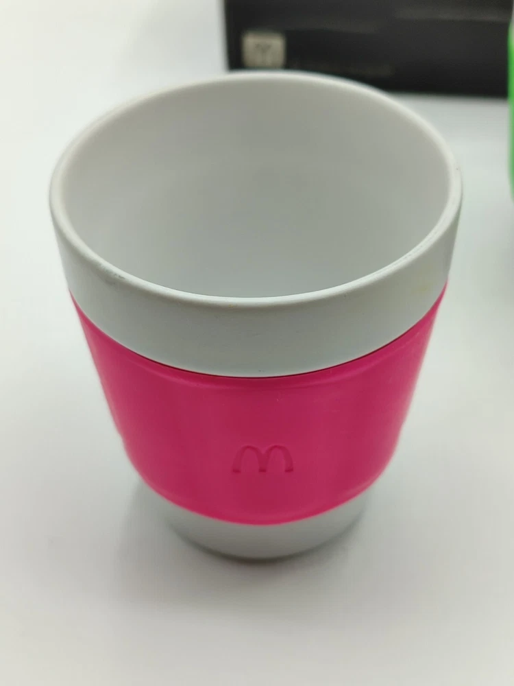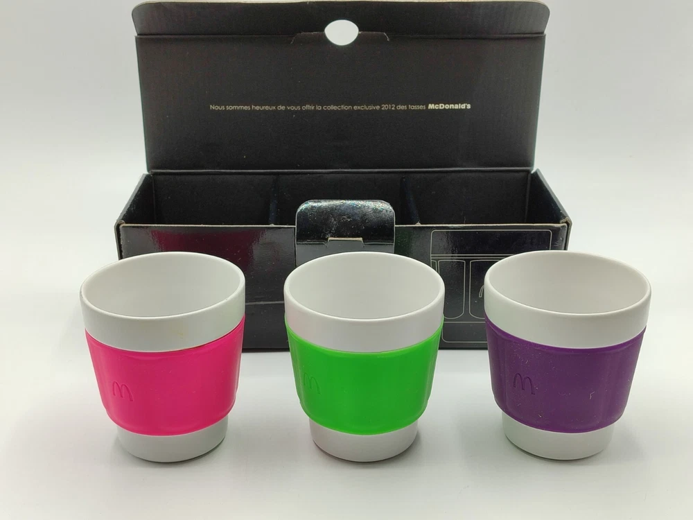 Lot 3 Tasses, gobelet à Café - Patrick Norguet X McDonald's - Coffret collector Dimensions : Hauteur : 8 cm Largeur : 7 cm Très beau coffret de 3 tasses Patrick Norguet X Mcdonald's. Couleurs : Vert flash, rose fuchsia et violet. Coffret en carton , peut présenter des marque du au stockage. Parfait état, pas de défaut visible sur les tasses.