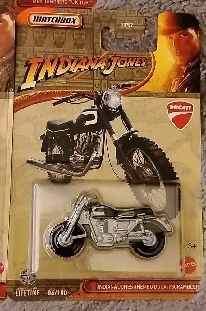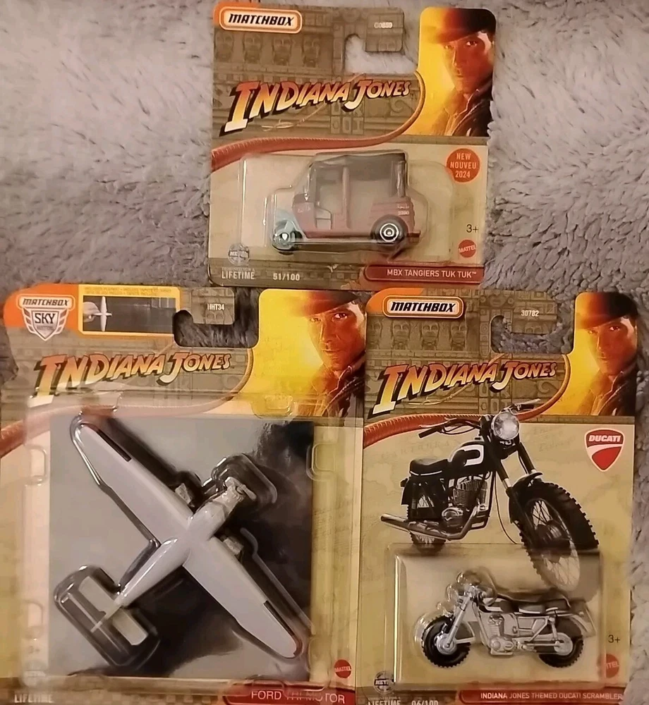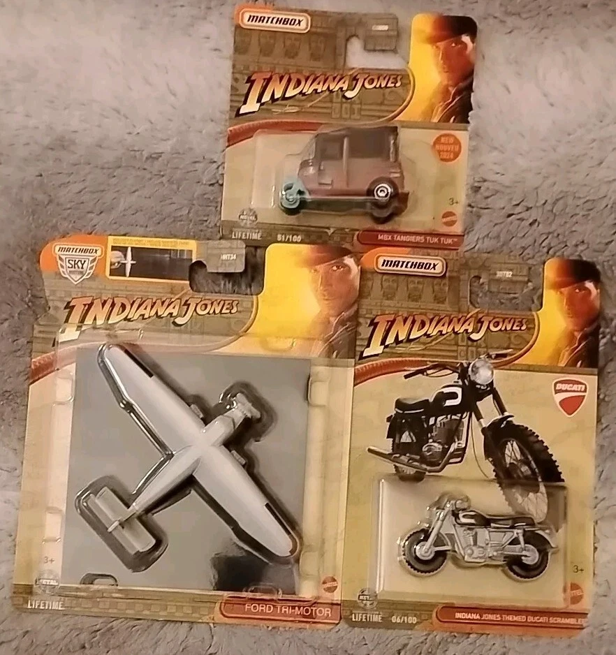 Introducing matchbox Indiana Jones ford tri-motor, Ducati scrambler, mbx tuk tuk. These rare hard to find matchbox Indiana Jones toys or an excellent addition to any collection of any age be one of the first to own these three awesome iconic Harrison Ford movies Indiana Jones in this three vehicle set. Cards may have minor issues due to shelving, refer to pictures for details, however these are in excellent mint condition.