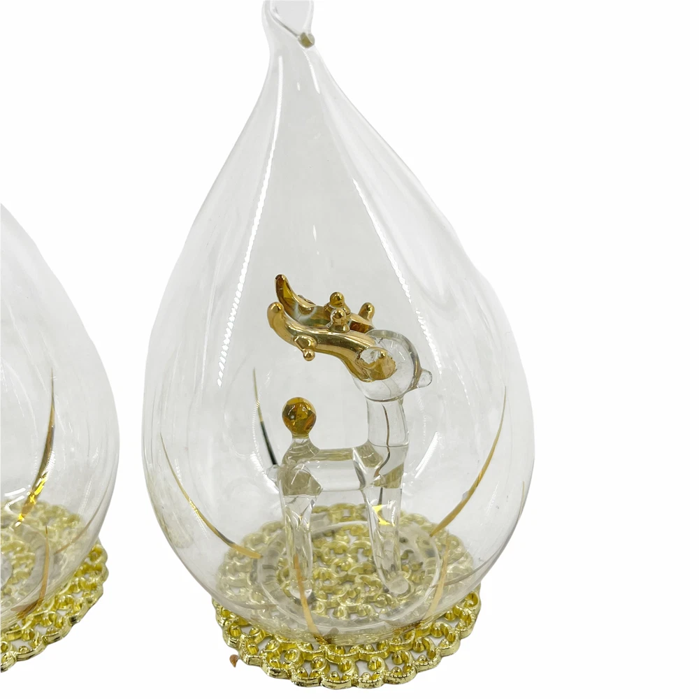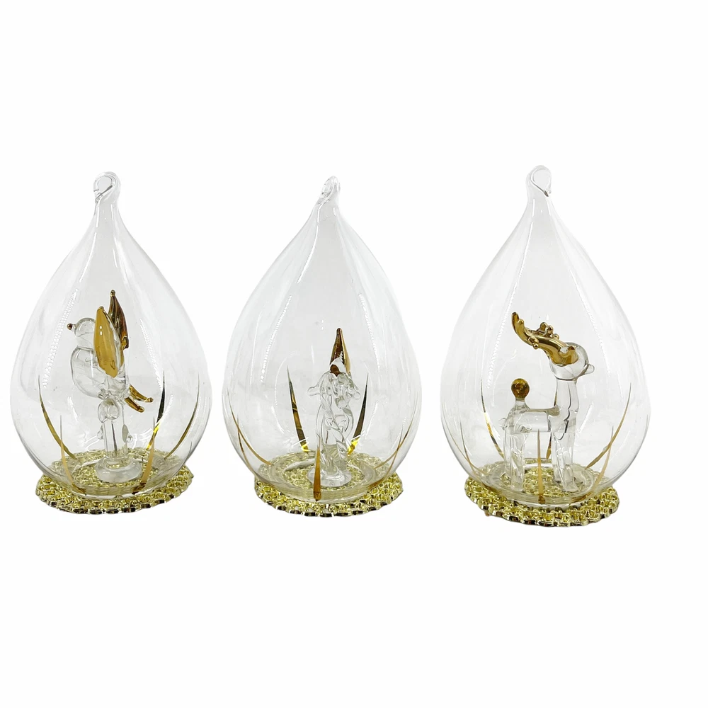 Lot of 3 Vintage Blown Glass Teardrop Christmas Ornaments Figural Reindeer Bird 2 1/2" diameter and 4 1/4" tall. Blown glass figural inside each - reindeer, candle, and bird. Encased in teardrop shaped ornament with gold tone filigree base. Can be hung or are free-standing.