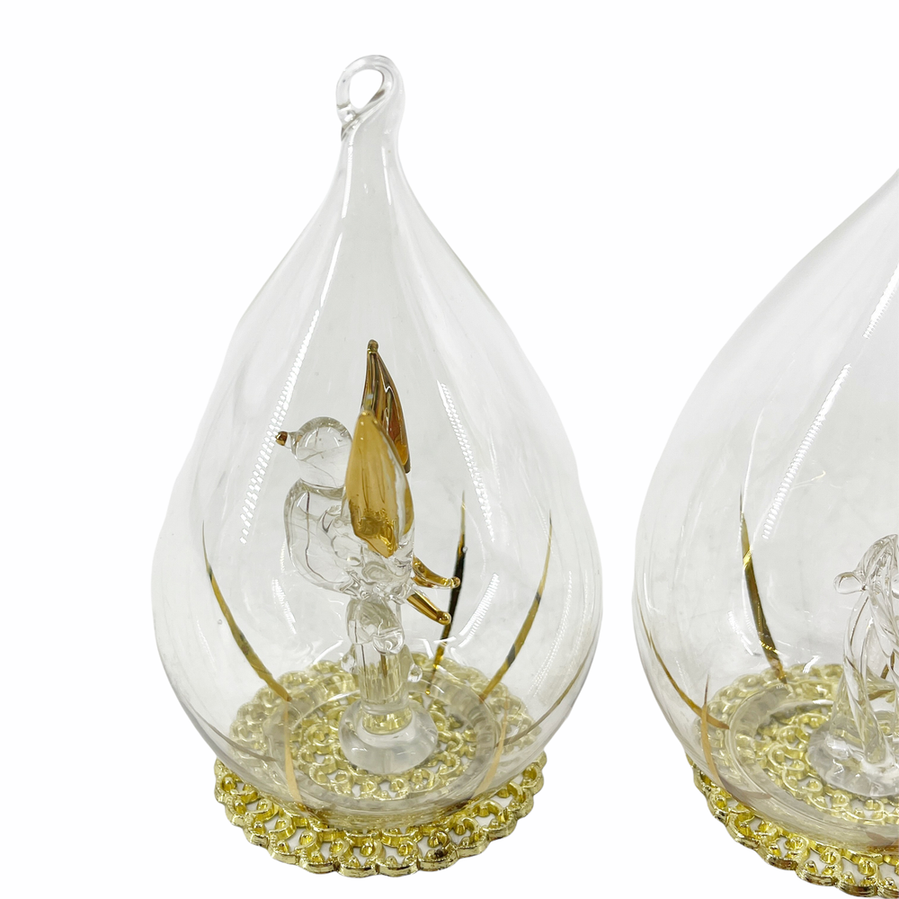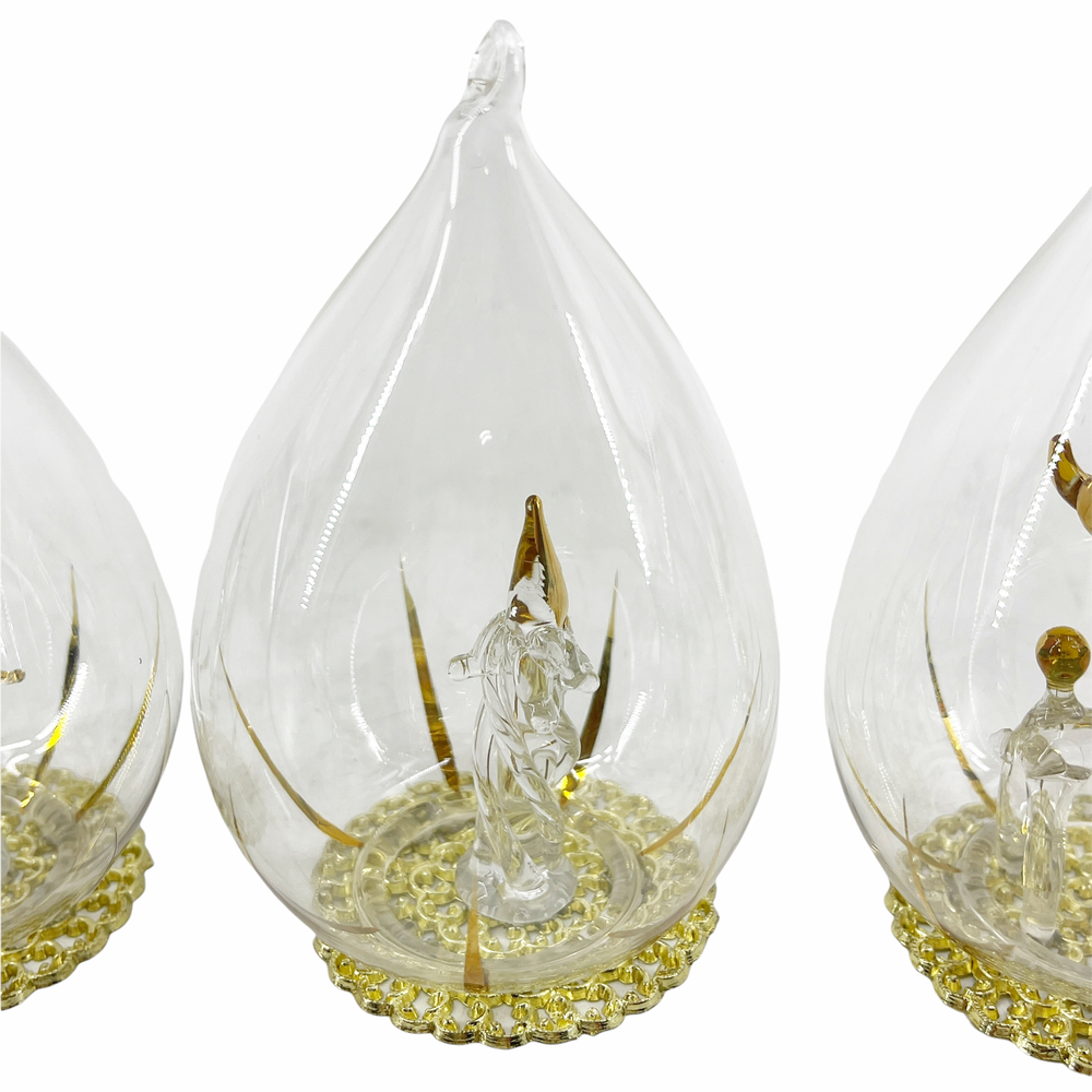 Lot of 3 Vintage Blown Glass Teardrop Christmas Ornaments Figural Reindeer Bird 2 1/2" diameter and 4 1/4" tall. Blown glass figural inside each - reindeer, candle, and bird. Encased in teardrop shaped ornament with gold tone filigree base. Can be hung or are free-standing.