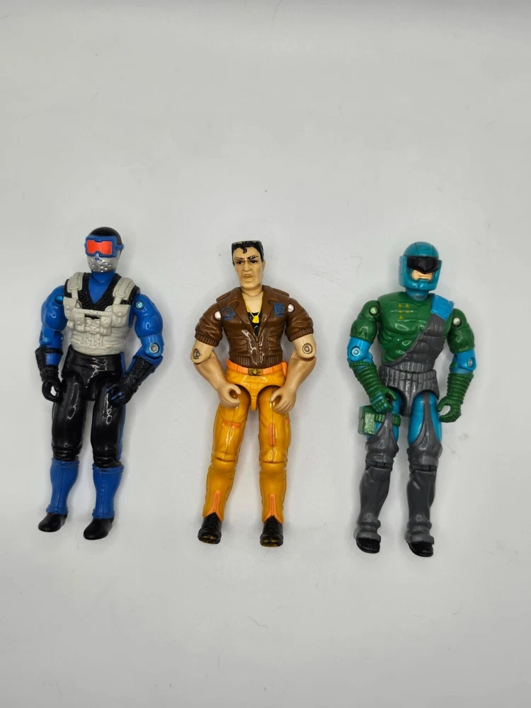 Lot of 3 Vintage G.I. Joe Figures – 1991 Snake Eyes, 1991 Grunt, 1992 Flak-Viper with Backpack This listing features three vintage G.I. Joe action figures from 1991-1992, each in good condition with some original accessories. Included in this Lot: 1991 Snake Eyes (v4) https://www.yojoe.com/action/91/snakeeyes4.shtml Condition: Good overall condition with some worn paint. Included: Figure only, no accessories. 1991 Grunt (v3) https://www.yojoe.com/action/91/grunt3.shtml Condition: Good overall condition with some worn paint. Included: Figure only, no accessories. 1992 Flak-Viper (v1) https://www.yojoe.com/action/92/flakviper.shtml Condition: Good overall condition with some worn paint. Included: Backpack missile launcher (no missiles). Lot Summary: These three G.I. Joe figures are great for collectors or fans of the classic series. The Flak-Viper includes a backpack missile launcher, though the missiles are missing. Perfect for display or as part of a restoration project.