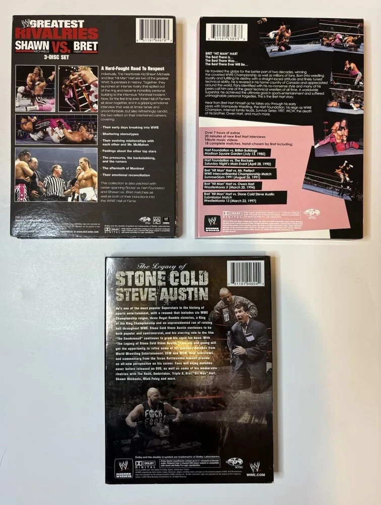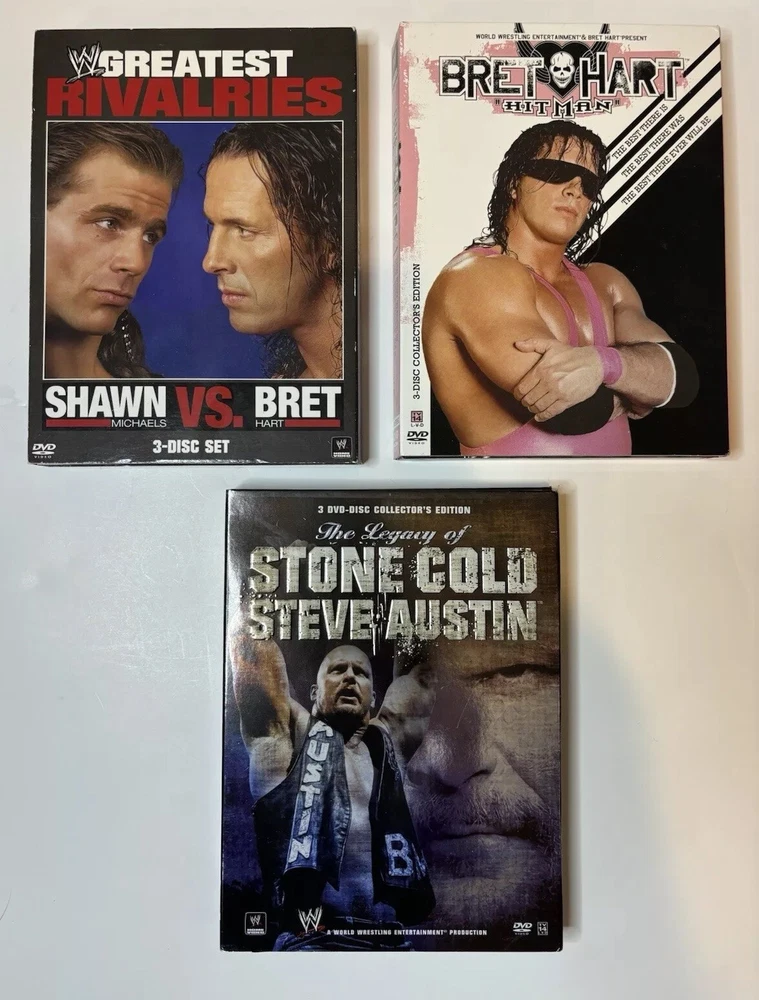 Lot of 3 WWE DVDs - Greatest Rivalries, Bret Hart, Stone Cold Steve Austin Selling from larger collection. Cases have been opened, but DVDs are in excellent condition. Feel free to message me if you have any questions or need any additional information. Typically ships out next day after purchase.