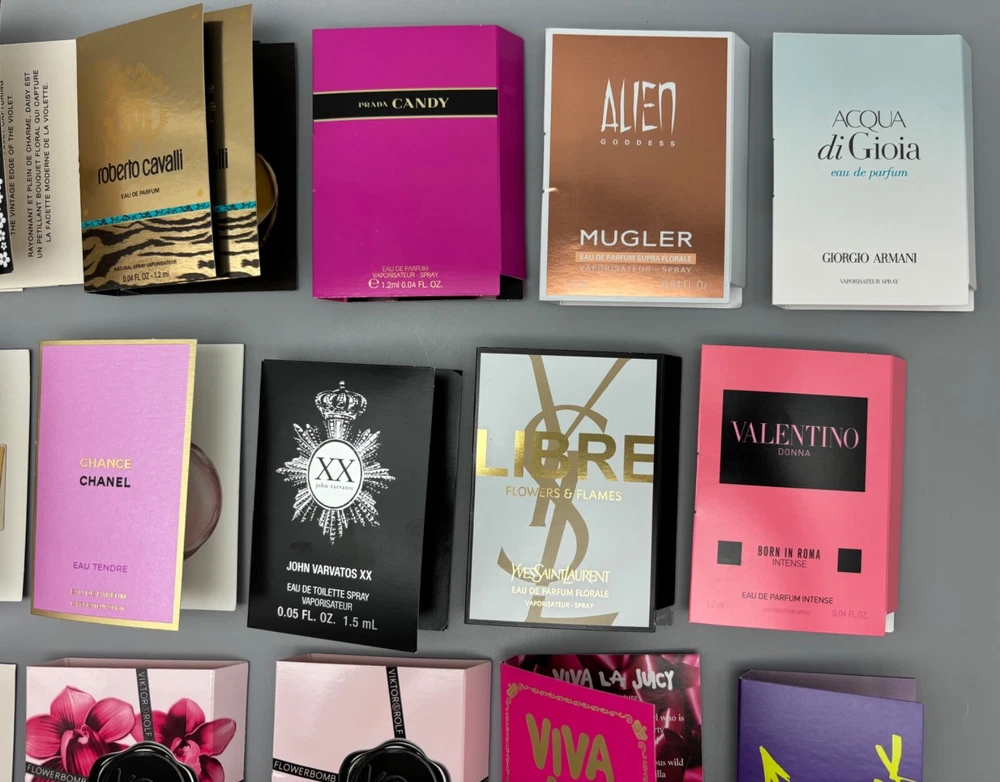 An incredible lot of 30 luxury high-end designer women's eau de parfum and eau de toilette samples in 0.04 fl oz and 0.05 fl oz sizes. Brand new with cards! Lot includes: Burberry Goddess Eau de Parfum Intense Mugler Alien Goddess Eau de Parfum Supra Florale John Varvatos XX Eau de Toilette YSL Libre Flowers & Flames Eau de Parfum Florale Chanel Chance Eau Tendre Eau de Parfum Chloé Love Story Eau de Parfum (x2) Prada Candy Eau de Parfum Valentino Donna Born In Roma Eau de Parfum Intense Giorgio Armani Acqua di Gioia Eau de Parfum Noyz 12:00 Eau de Parfum Viktor & Rolf Flowerbomb Eau de Parfum Viktor & Rolf Flowerbomb Ruby Orchid Eau de Parfum Roberto Cavalli Eau de Parfum (x2) Marc Jacobs Dot Eau de Parfum Marc Jacobs Daisy Eau de Toilette (x3) Marc Jacobs Daisy Eau So Fresh Eau de Toilette (x2) Juicy Couture Viva La Juicy Eau de Parfum Florence by Mills Wildly Me Eau de Toilette Kylie Jenner Cosmic Eau de Parfum Vera Wang Princess Eau de Toilette (x2) Vera Wang Lovestruck Eau de Parfum Vera Wang Lovestruck Floral Rush Eau de Parfum Calvin Klein One Shock Street Edition Eau de Toilette DKNY Pure Eau de Parfum
