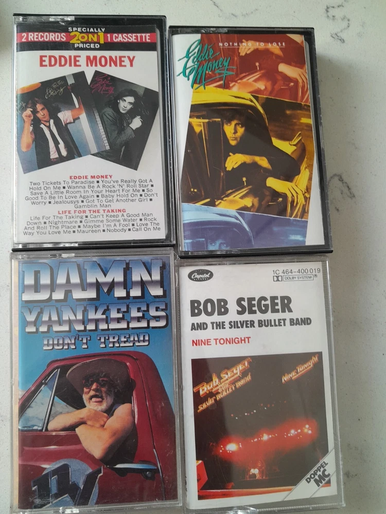 Lot of 34 Cassette Tapes featuring classic artists from the 60s, 70s, and 80s such as Meatloaf, The Clash, Journey, and Aerosmith. The music style is Hard Rock with genres including Acid Rock, Rock, Rock 'n' Roll, and Metal. The cassettes are in Very Good condition with Good inlay, all in English language. The color of the cassettes is Pink.