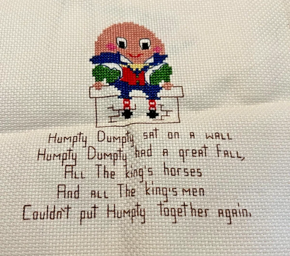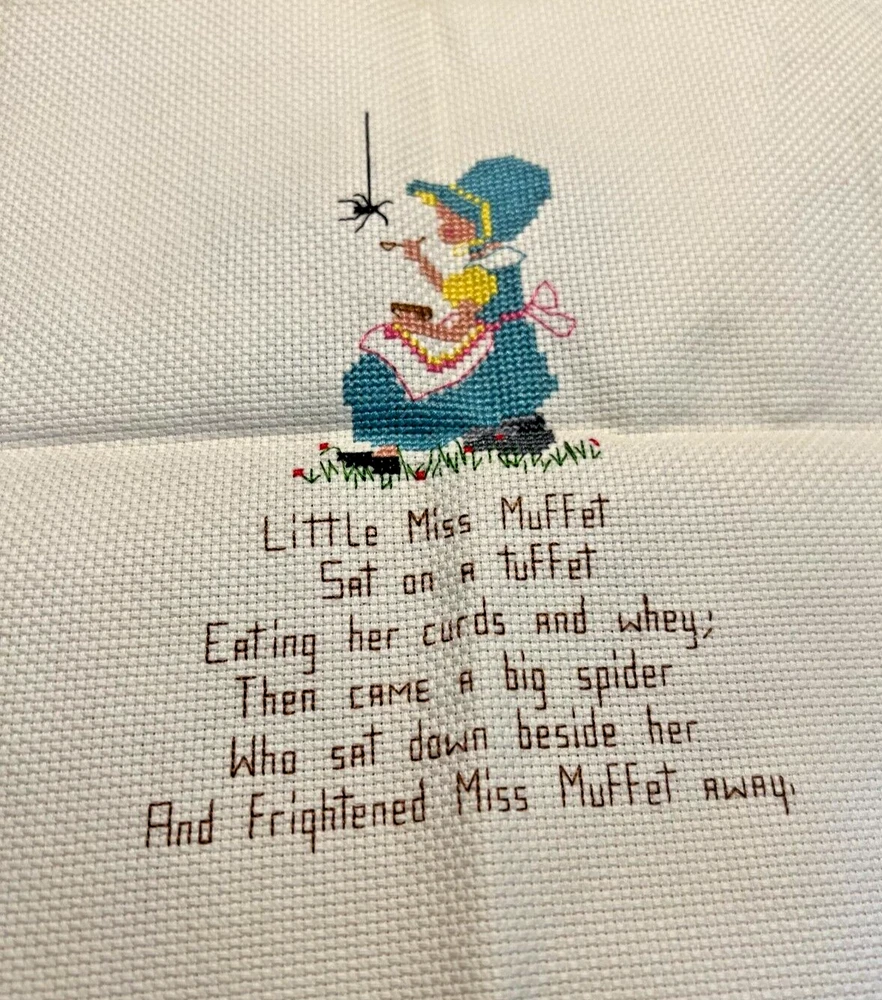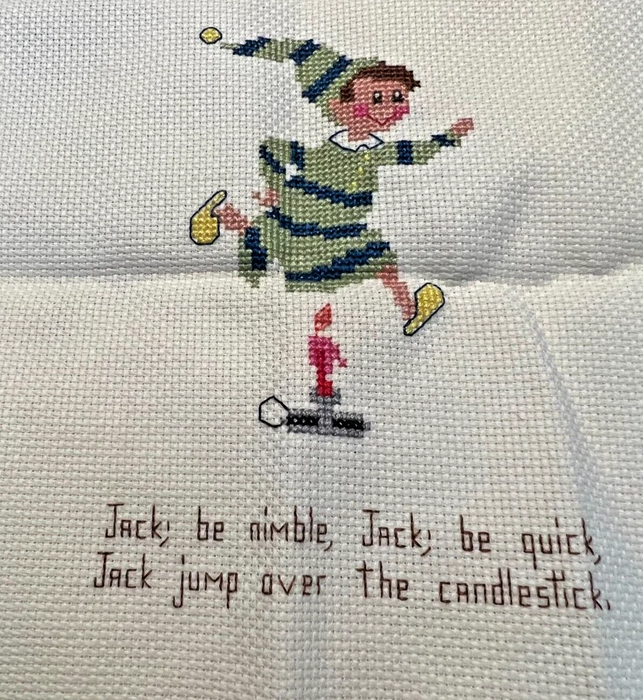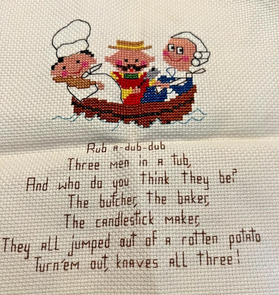 4 Completed Cross Stitch Nursery Rhymes Little Miss Muffin Humpty Dumpty Jack B. Nimble 3 Men in a Tub Cream color Aida cloth Appears to be 11 ct. Well executed Faint line drawn on each cloth for an 8 X 10" opening Small marks outside of 8 x 10" guide lines Very good condition - ready to mount and frame No returns, thanks From a smoke free, pet friendly environment Over 1900 positive eBay feed backs