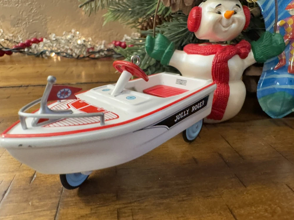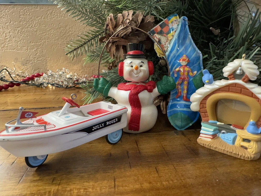 Lot of 4 Hallmark Christmas Ornaments Die Cast Kiddie Car Boat Snowman Tin Sock