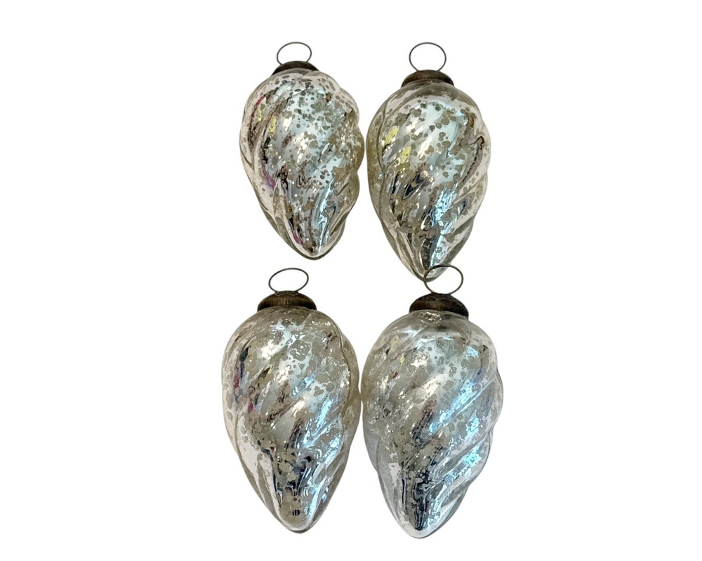Add a touch of rustic charm to your Christmas tree with this lot of 4 silver mercury glass ornaments. These small pinecone-shaped ornaments are perfect for creating a unique and personalized holiday decor. . The set includes 4 ornaments.. These ornaments are perfect for adults and are sure to add a touch of Christmas spirit to your home. Get your hands on these rustic and elegant ornaments today! Smoke free home Please visit my store at https://www.ebay.com/str/theuniqueredhead . Thank you for your consideration. Please message me if you have any questions. I do combined shipping on my items in the store.