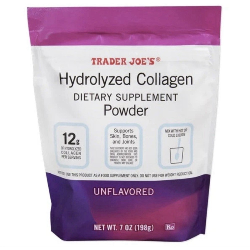 Main Purpose: Anti-Aging Flavor: unflavored Formulation: Powder Expiration Date: 9/18/2028 or After Type: All-in-One Product Dosage: daily Features: Hydrolyzed Department: Adult Number of Pills: 7oz Ingredients: COLLAGEN HYDROLYSATE. Brand: Trader Joe's Active Ingredients: Protein Item Weight: 7oz x 4 bags