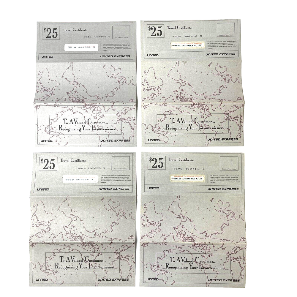 Lot of 4 United Express Travel Voucher $25 Coupons Collectables Non Redeemable Discount Amount: $25 Four unused United Express $25 discount travel certificates. These collectible certificates have no redeemable value and are solely for collectors. They were manufactured in the United States and are a must-have for aviation and transportation enthusiasts. Please note that these certificates cannot be used for any travel discounts. If you have any questions, comments or concerns please don't hesitate to reach out, we do our best to answer all questions that come to our inbox.