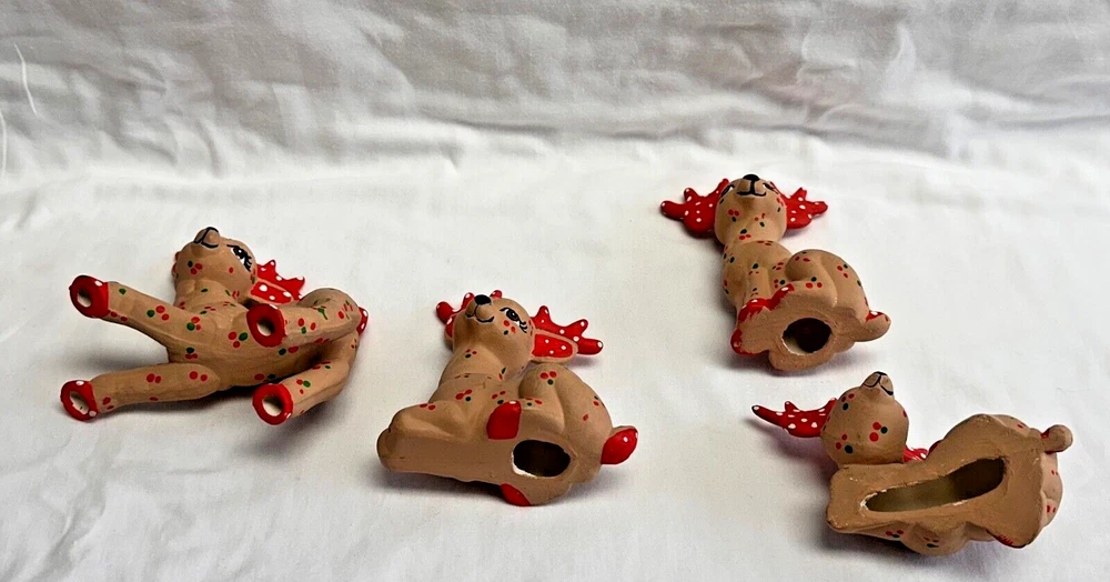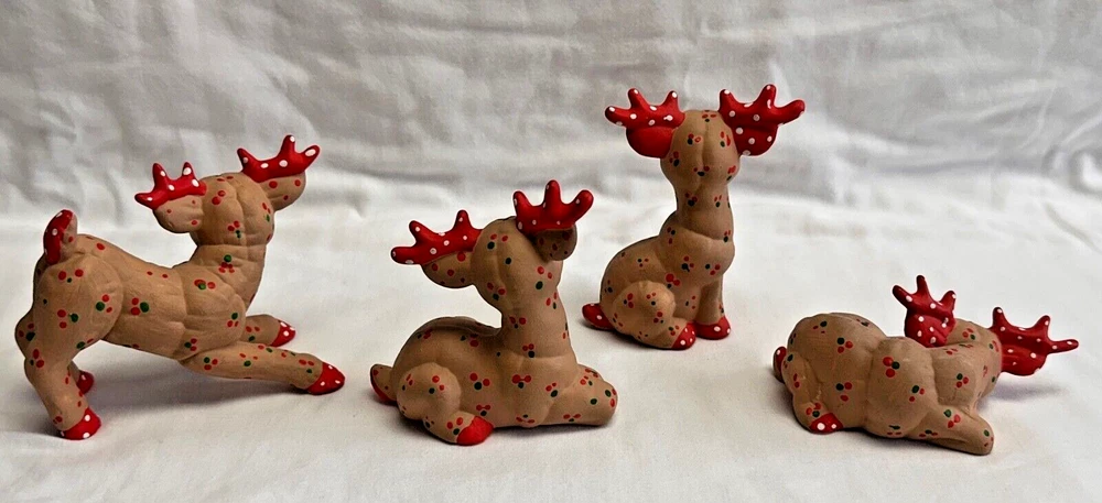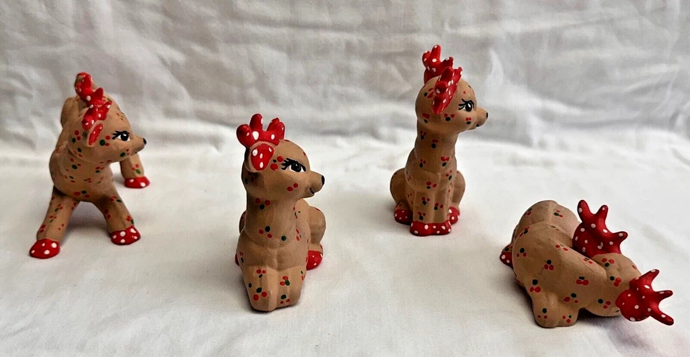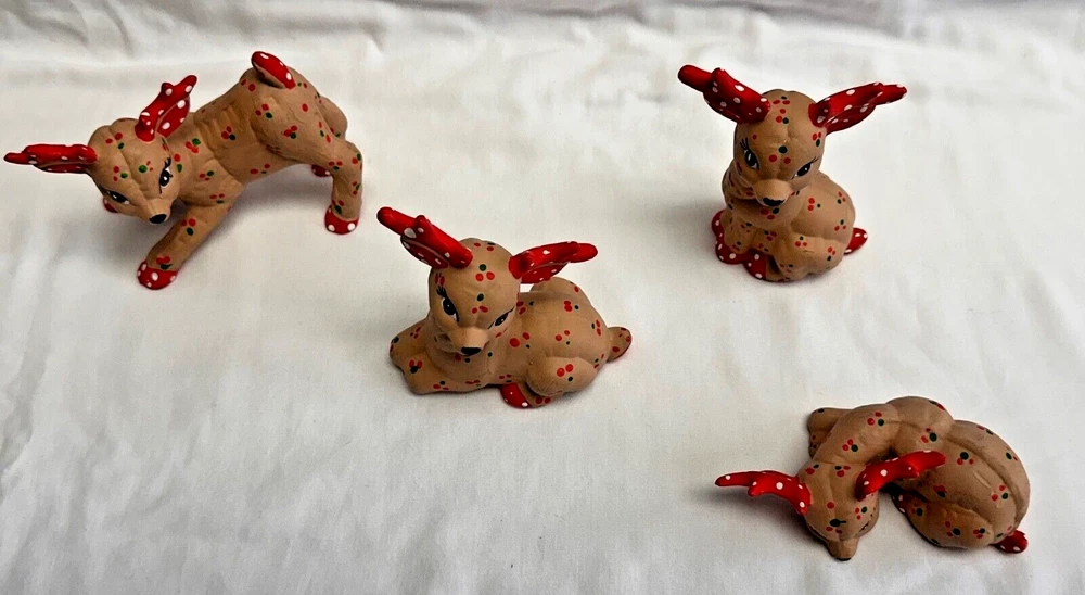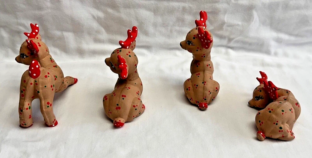 Lot of 4 Vintage, Ceramic, Kimple Reindeer These sweet figurines are in good condition. From our observations we do not see any chips, cracks, crazing, etc. Please see photos up close as part of the description. These figurines measure around 4" each, with variation depending on the position. We are happy to answer your questions or provide additional photos if requested. Shipping costs are figured by the carrier based on shipping address, size of package, and weight. We do not have any control over shipping costs and do our best to offer the most affordable options for you to select from. **We will combine shipping!! If you purchase more than one item, please send us a message before you pay to let us know if you'd like combined shipping. If you do, we will invoice you to prevent you from paying more shipping than necessary. All purchased items will be shipped within 3 business days after payment has been received. We do not ship on weekends or holidays. 100% of the proceeds generated from this sale goes toward the operating expenses of our in-patient hospice houses, Eaton Community Palliative Care. www.echospice.org Thank you for Looking and Happy Bidding! Check out our other listings :) ~ Items sold in our store come from estates and donations and are shipped in the condition presented in the listing. Please note, we are not dealers, collectors, or appraisers. As a buyer, please ask as many questions as you need to make an informed purchase. Also, look very closely at the photos provided as they are part of the item description. W e are happy to provide more photographs or answer questions for the purchaser to ensure the transaction is a positive experience for both purchaser and seller. If you are unhappy for any reason at all, please message us with concerns as a courtesy before leaving feedback. We always appreciate an opportunity to make the situation right when possible. Reimbursement for damages that occur during shipping are the responsibility of the carrier and seller will assist with filing a claim if needed. All original packaging needs to be saved in order to process a claim.