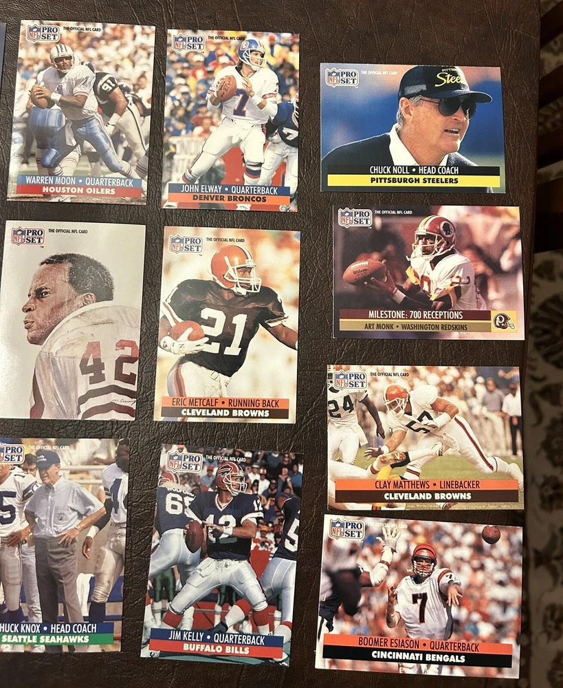 This lot of sports trading cards features 45 original cards from the NFL Pro Set, as well as NBA and MLB cards. The cards are made of card stock material and come with a signed David Nelson card. The set includes cards of famous players such as Ozzie Smith, Randall Cunningham, and Reggie White, as well as coaches like Bill Belichick and Mike Ditka. The cards are in standard size and are perfect for collectors of vintage football memorabilia. The set is a great addition to any sports trading card collection and is a must-have for fans of the Cincinnati Bengals, Houston Oilers, and San Francisco 49ers.