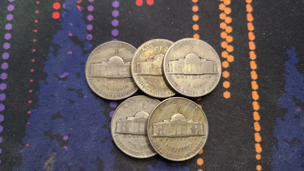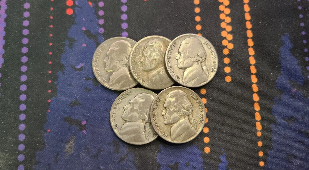 This listing is for a lot of 5 randomly selected circulated 1942-1945 Jefferson silver wartime nickels. Stock photo for reference only, actual received nickels will vary. Shipping is free