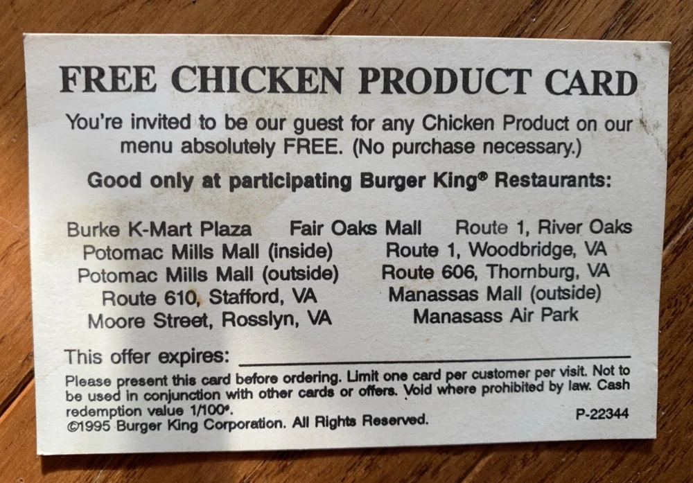 Country of Origin: United States Brand: Burger King Value (Dollars): 0