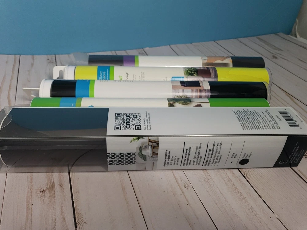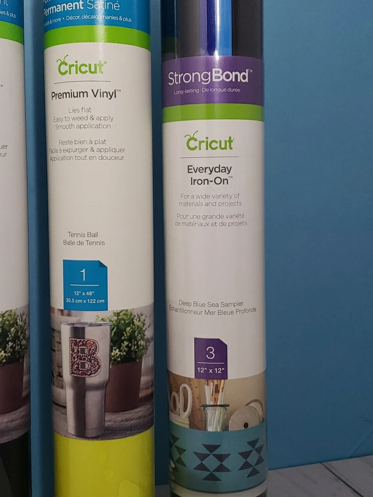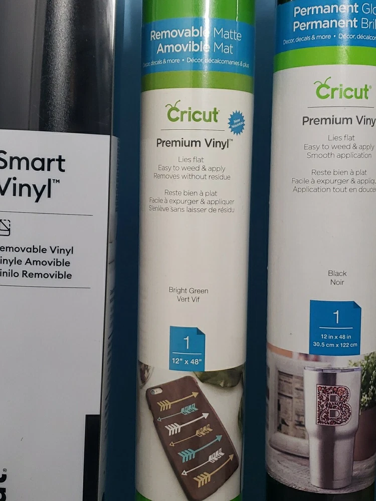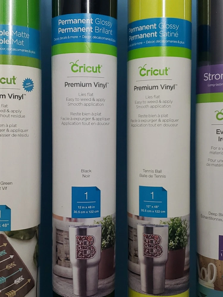 Lot of 5 Cricut Permanent Glossy Premium Vinyl 12" x 48", Removable Iron On New New in Lot Permanent Glossy Premium Vinyl 12" x 48" - Black Permanent Glossy Premium Vinyl 12" x 48" - Tennis Ball Removable Matte Premium Vinyl 12" x 48" - Bright Green Strong Bond Everyday Iron-on 12"x12" - Deep Blue Sea Sampler Smart Vinyl Removable 13" x 13" - Matte Black