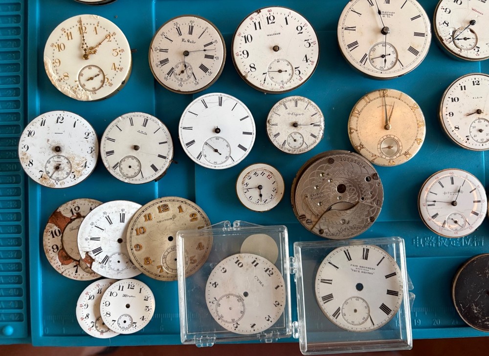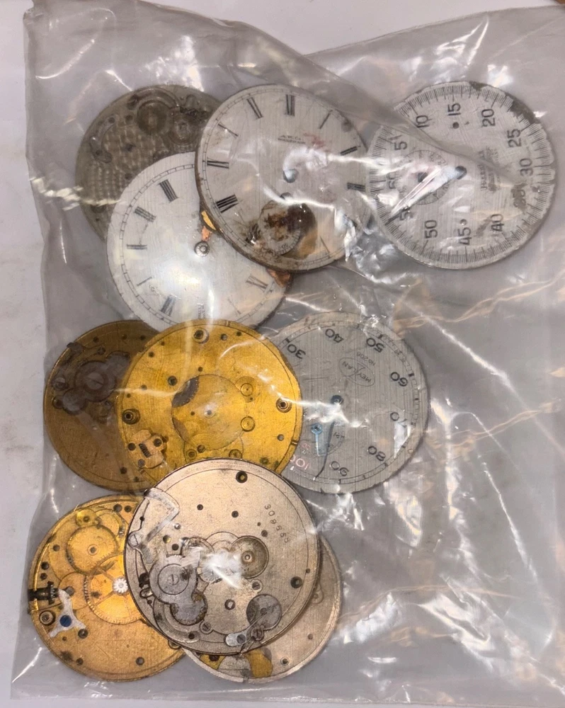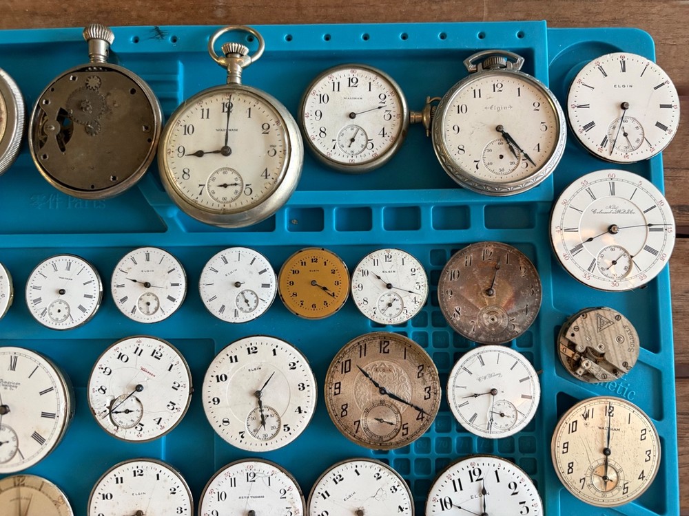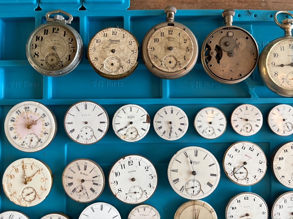 Large lot of 51 antique mechanical pocket watches, total weight of everything included is 5 pounds 15 ounces. The majority of these are complete with the exception of missing hands. I went through these and most have an issue at the balance wheel but it appears the escapement is working correctly on most. Meaning you can engage the escapement wheel and make them “tick” however they will still need work on the balance wheel. There are 11 that wind up and run fine. Also included are some extra dials and 12 dissasembled movements and two antique pocket watch movements. There are a couple lower end Ingersoll watches in the top row that are more parts but one is in a case. There are a couple cases that are complete maybe needing a new crystal, couple need backs. The cases are silveroide or nickel. Brands Included: Illinois Watch Company, Elgin, Waltham, LaSalle, Hamden, G.W. Davey, Soldale, Seth Thomas, Fortuna, A.W. Co, Herald, Diamond Special (21 Jewel), Locust. Couple dials are Elgin, CYMA, Pain Brothers Hastings “True Briton”, Hampden, Sentinel, Admiral, South Bend. There are no extra crowns and pins included in this listing. A few watches have the stem inside them you can turn and wind up. The cases all have crowns and stems. Item Size: Varying Item Condition: For parts or repair. I cannot test each component of each of these watches. Although 11 wind up and run, I have not tested time accuracy or monitored for longer than to confirm they wind up and run. Many of these are likely easy fixes and absolutely great for donor parts if that’s what you choose. Items Included: Watch only. Returns Accepted: No, due to nature of age of watch and buyers scalping needed pieces. Please view description and all photos showing condition to make your decision on purchasing. Please note: ALL photos and video are of the actual item listed in this sale or supporting documentation of the item. Shipping: All items are shipped typically within 2 business days. Tracking is provided. All items above $100 in value will have added insurance added and tracking. All luxury/premium watches will have an option to first ship to an authenticator. Returns: I have a select policy on returns for certain items please read this and ask any questions you might have. I do my best to provide an abundance of details of each item including photos, videos in most cases, wrist size for wrist watches, watch case diameters, etc. I am happy to provide additional photos or answer questions before you commit to purchase but please measure your wrist to ensure the proper fit for yourself. Antique items as an example including parts watches that are sold as for parts or not working will not have a return option available. All approved returns need to be completed within 14 days and all items with a value of $100 or more need to have insurance coverage for the original sale price. All items that originally went through authentication must return back through the authenticator prior to return and refund. Item #: 0004