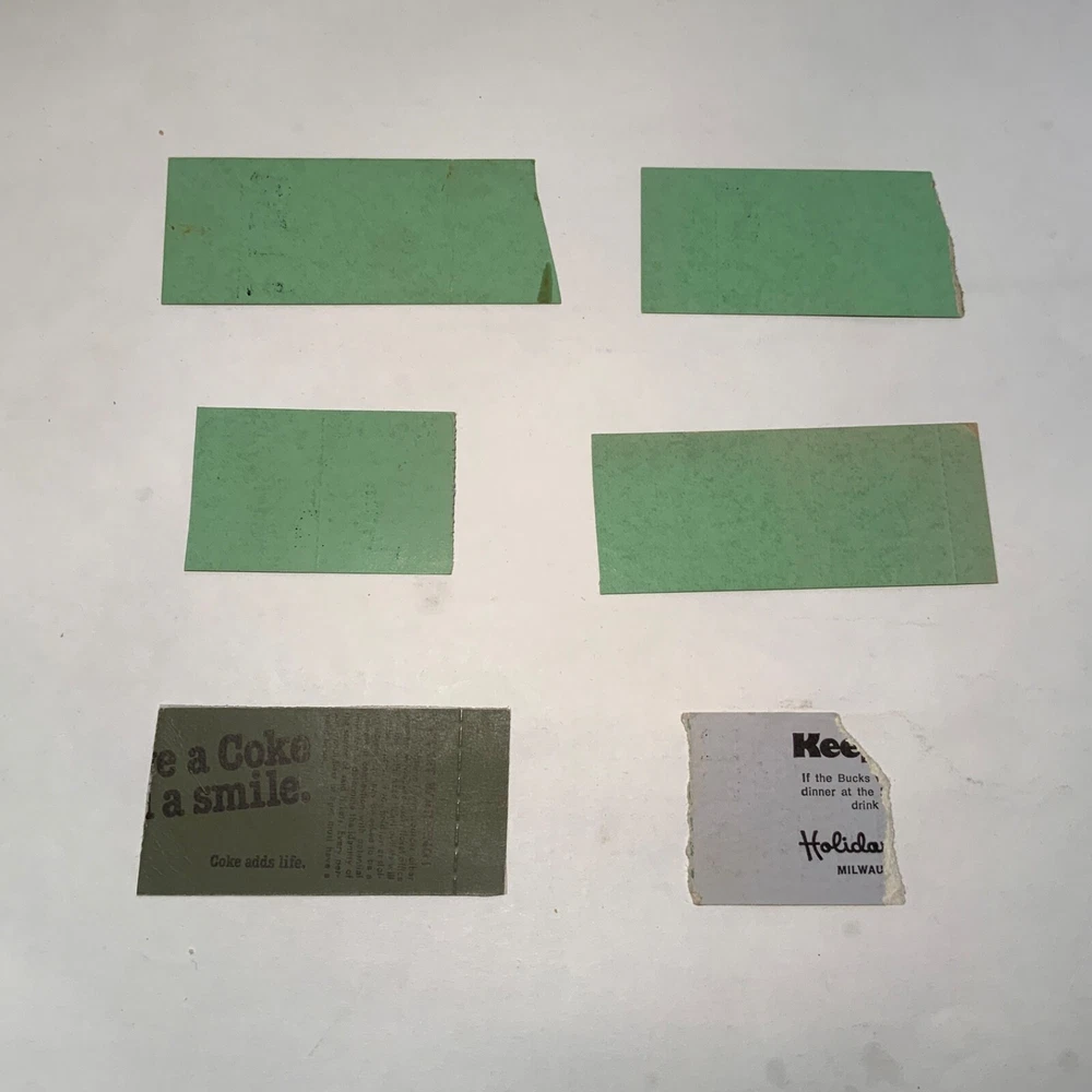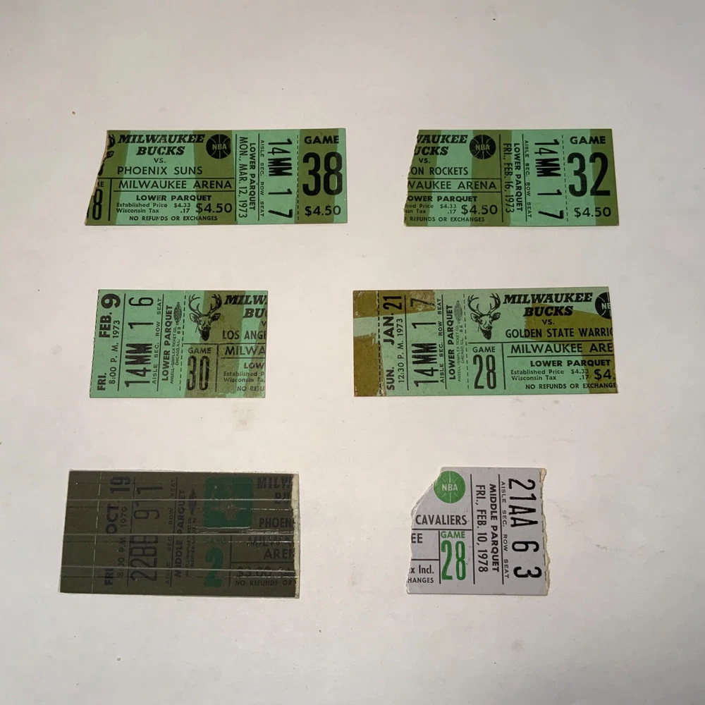 Good - Very Good. Lot of six Milwaukee Bucks tickets from the 1970’s: 1. January 21, 1973 - Bucks 124 / Warriors 108. Kareem 27/13. Thurmond 11/17. 2. February 9, 1973 - Bucks 109 / Lakers 88. Kareem 29/24. Wilt 8/14. 3. February 16, 1973 - Bucks 105 / Rockets 103. Kareem DNP. Big O - 31 points. Rudy T. 29/11. 4. March 12, 1973 - Bucks 126 / Suns 95. Kareem 34/23. Big O 25/7/12. 5. February 10, 1978 - Bucks 108 / Cavaliers 98. Elmore Smith 24/10. Meyers/Bridgeman 22 points each. 6. October 19, 1979 - Bucks 95 / Suns 94. Sidney Moncrief - 2nd game of career. Pat Cummings - 4th game of career. (Tape)