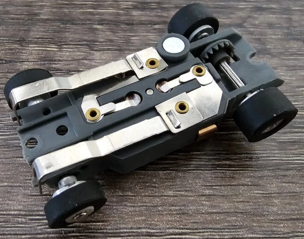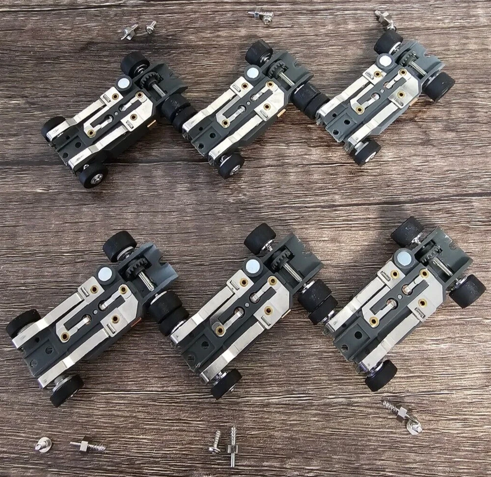 This New Lot of 6 Auto World ThunderJet Ultra G Slot Car Chassis is brand new. I will include the screws pictured above in a bag. I will combine shipping on multiple auctions. These cars also feature an adjustable wheel base
