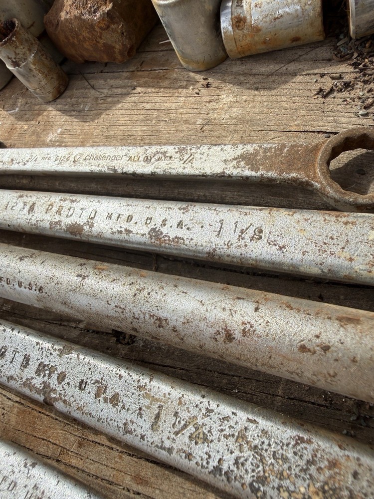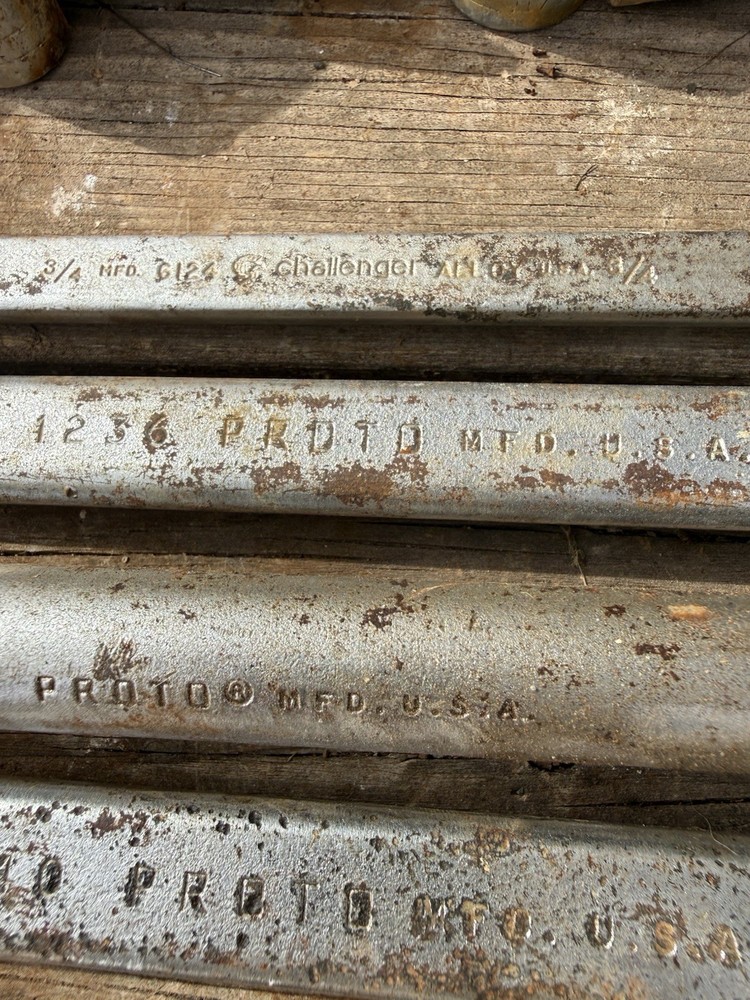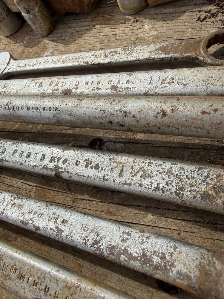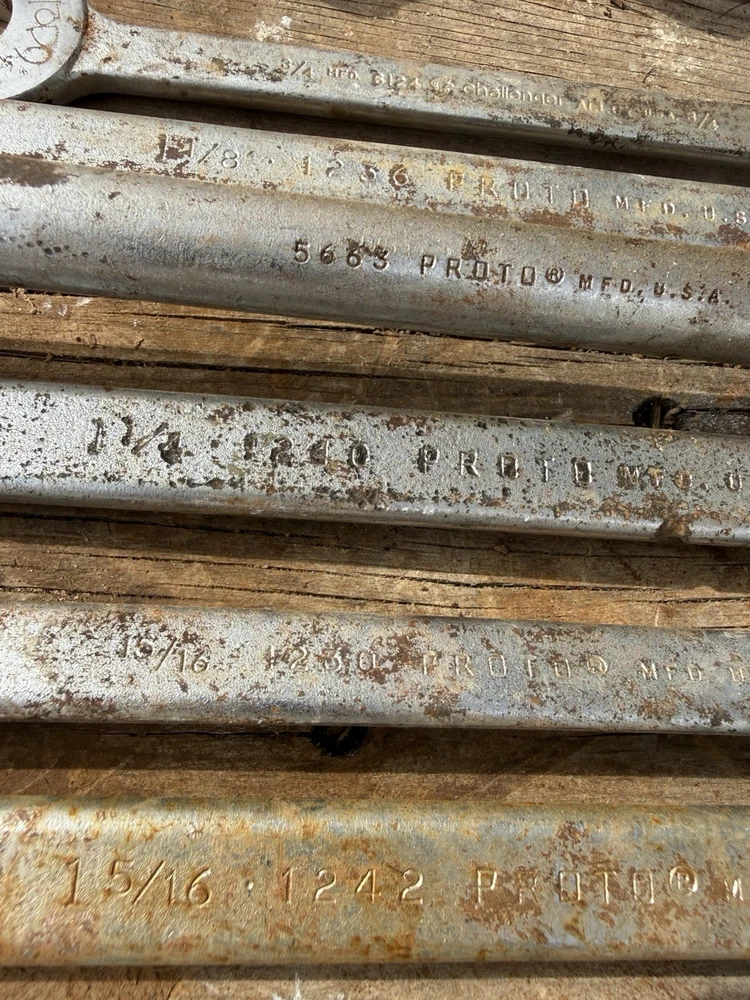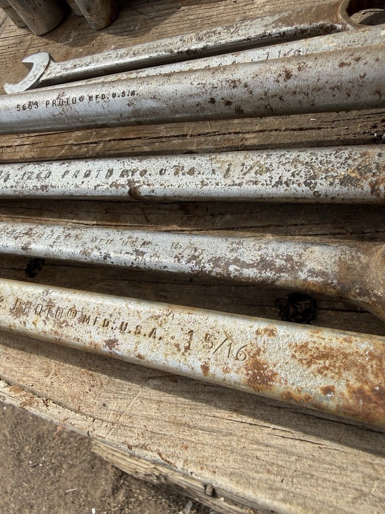 The product is a set of 6 vintage Proto oversized combination wrenches, made in the USA. The set includes several sizes of wrenches, perfect for collectors of vintage tools or mechanics looking for high-quality American-made tools. With the trusted brand of Proto, these wrenches are sure to be durable and reliable for various mechanical tasks. This lot offers a unique opportunity to add some classic tools to your collection or workshop.