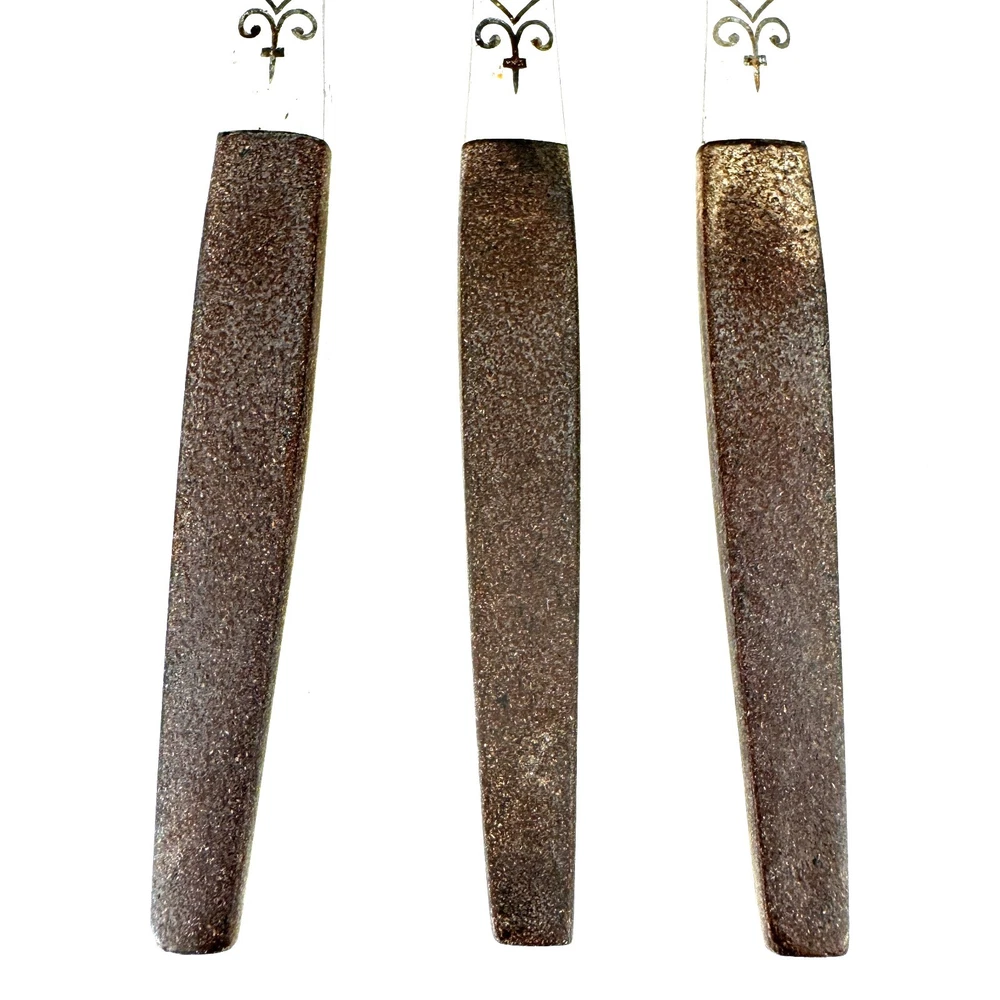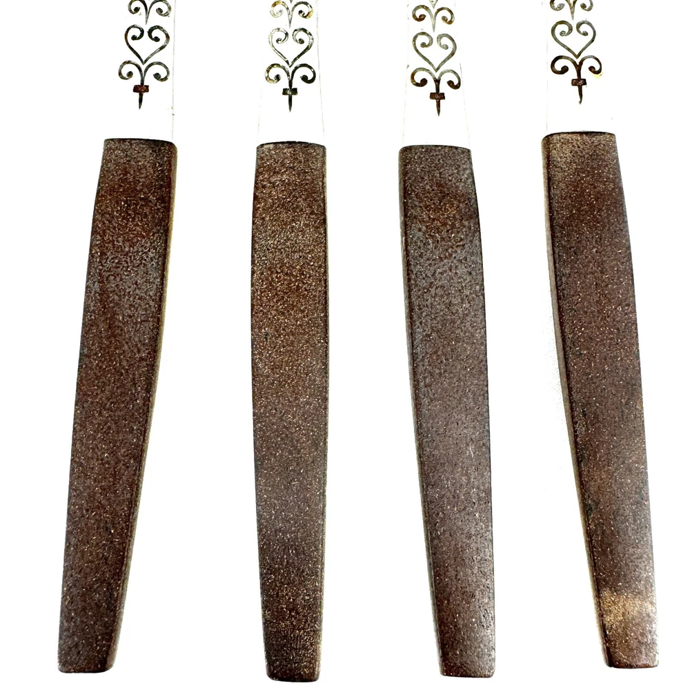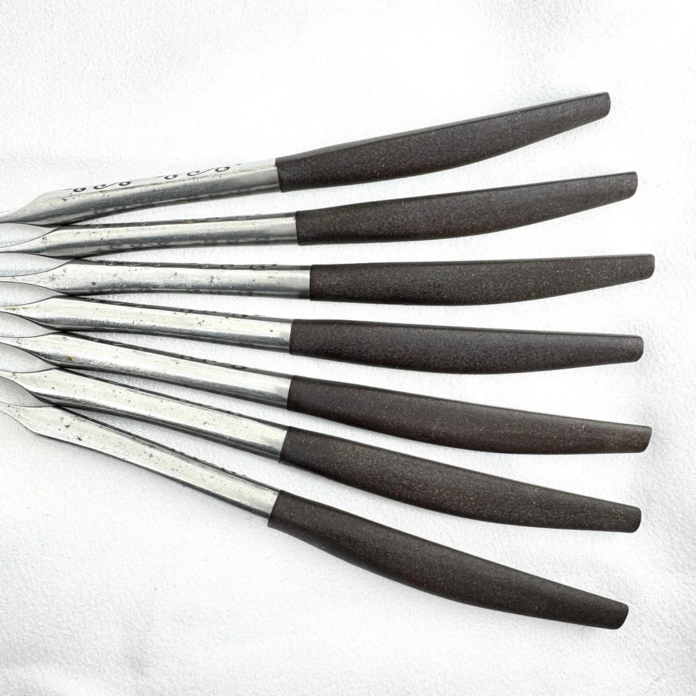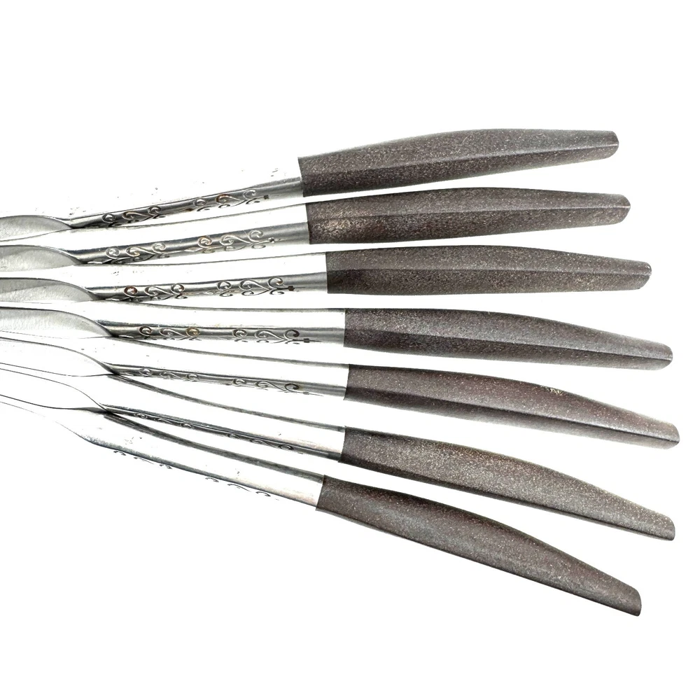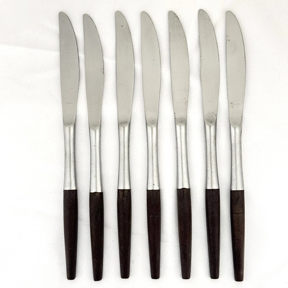 Offering a set of 7 Interpur INR2 dinner knives 8 7/8” long, mid-century modern style, a discontinued pattern made in Japan. The brown synthetic handles are sturdy and have cracks, as shown in the close-up photos. The stainless steel is in good condition, no chips, dents, or disposal damage. There are surface scratches, some pitting, and wear consistent with normal use. Please view the photos for details and condition. Measurements and photo colors are approximate. For extra protection your items will be packed in plastic sleeves and shipped in a box. Shipping is your choice of USPS Ground Advantage or USPS Flat Rate Priority at the rate determined by eBay. Follow your item's delivery progress with the USPS website Tracking Tool. Terms of Sale: Photos are of the actual item you will receive and sold "as is". Placing an order is your agreement that you know what you are buying, have viewed the photos and find the condition acceptable. Use eBay Messages to contact me for questions or concerns about your order. Please inspect your items upon arrival and contact me if there are any problems. Free returns within 30 days after delivery.
