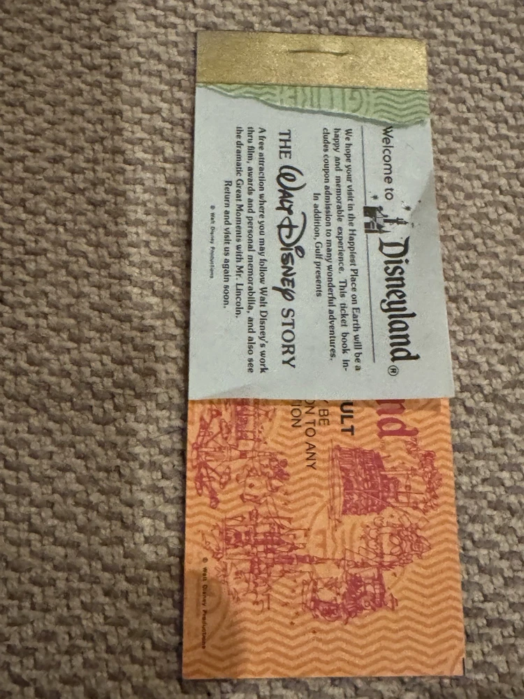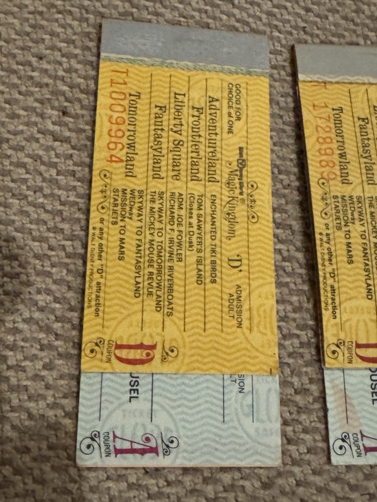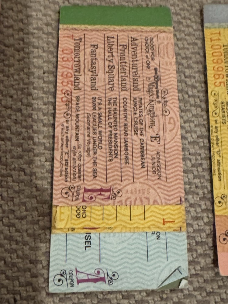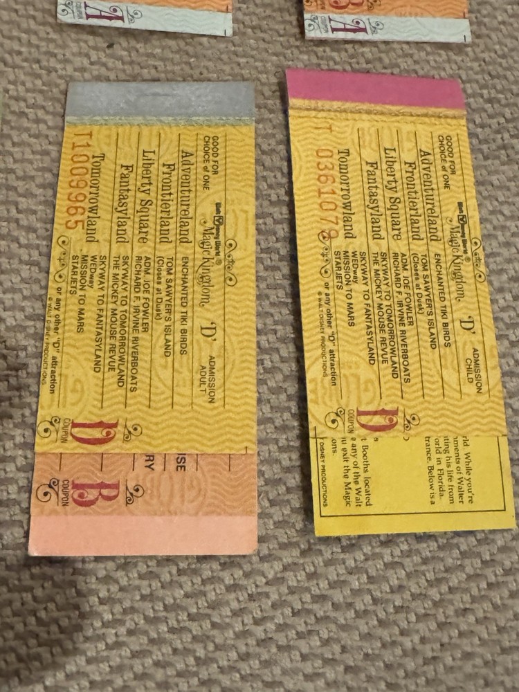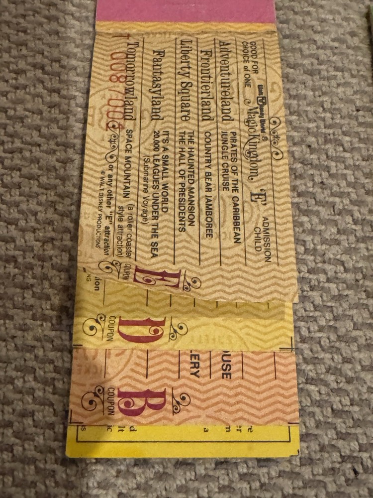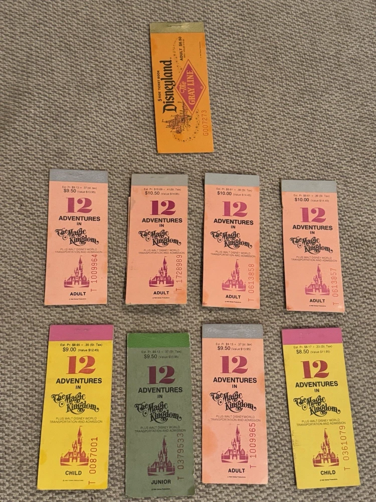 Lot of 9 Original Partial Ticket Coupon Booklets, both for children and for adults, for Disney World and for Disneyland from the late 1970’s. In good condition. Please see our pictures. Will ship promptly. Manila envelope video game cabinet