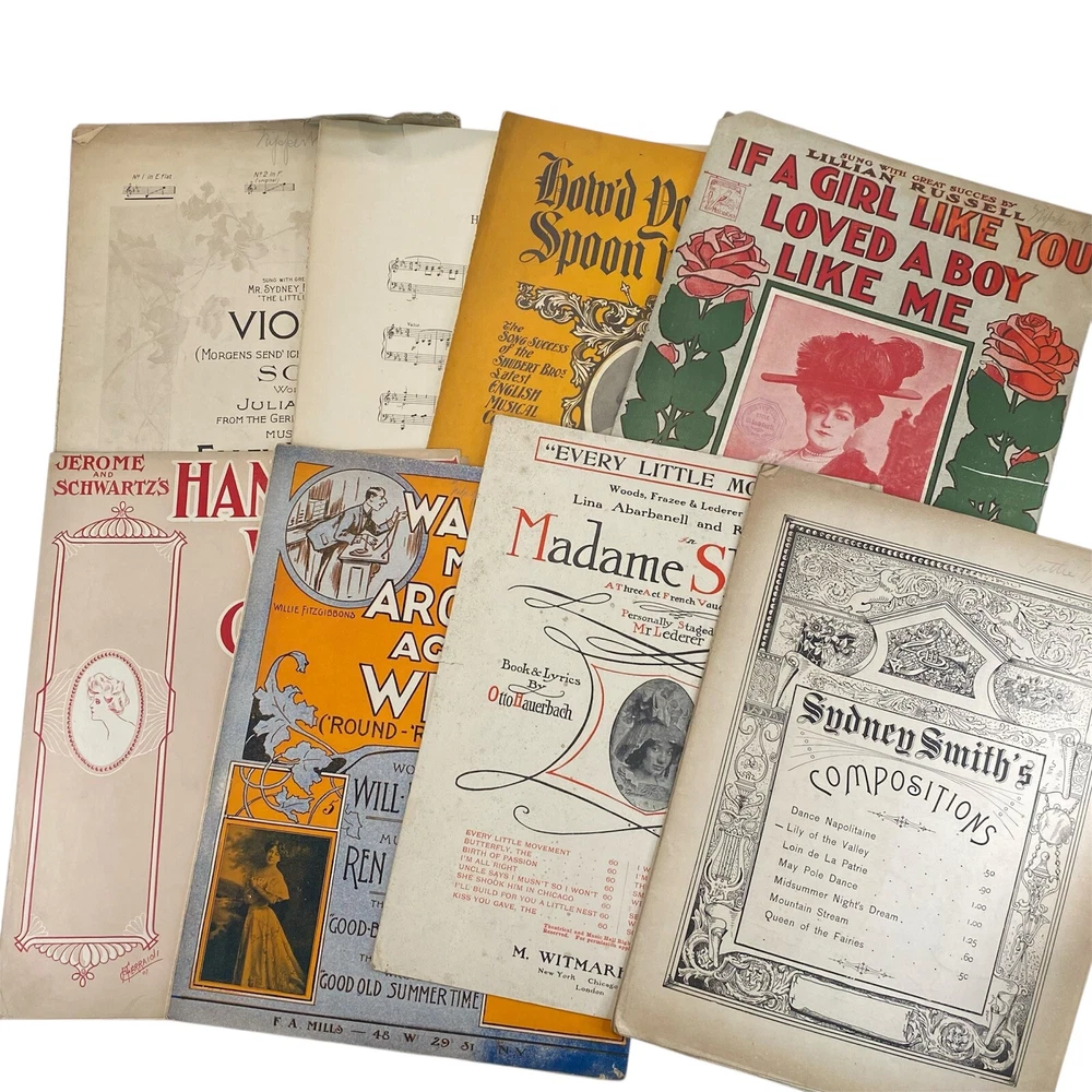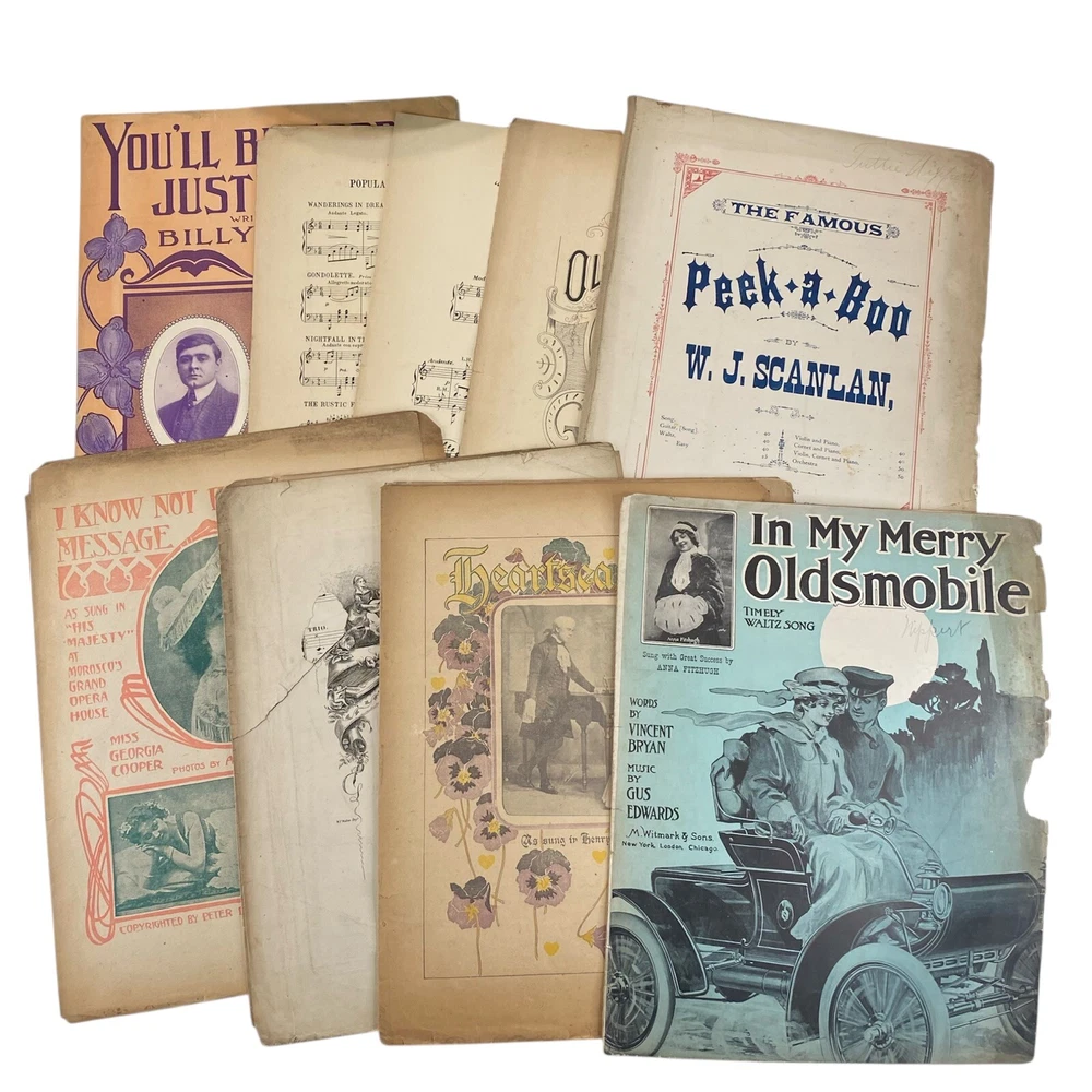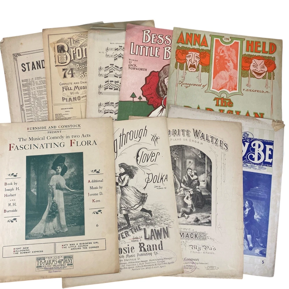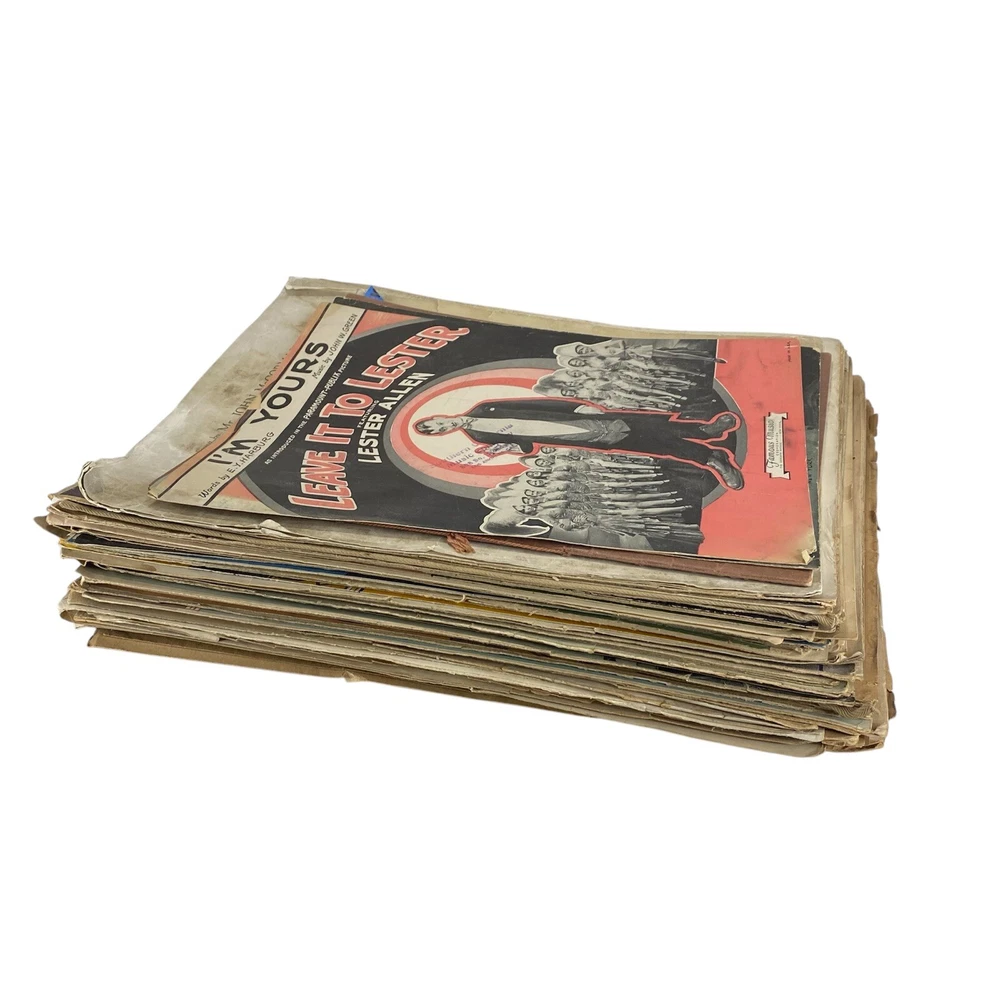 Dive into a treasure trove of musical history with this extensive lot of over 90 vintage sheet music pieces. Signs of wear, stains, rips present. Each piece is a testament to the golden age of piano vocals and musicals, offering a unique glimpse into the past with its very worn pages telling stories of performances and practices. The collection features an eclectic mix, showcasing a wide range of genres and composers. It's an ideal find for collectors, musicians, or anyone with an appreciation for the tactile beauty of analog music. Whether for performance, display, or research, these sheets are a tangible link to musical heritage.