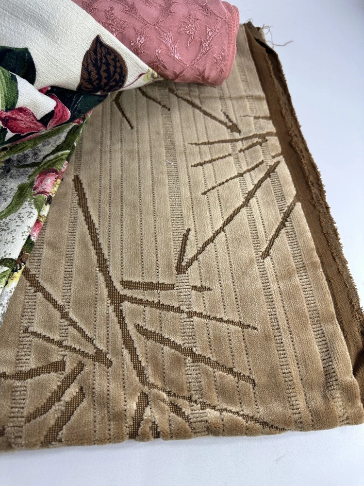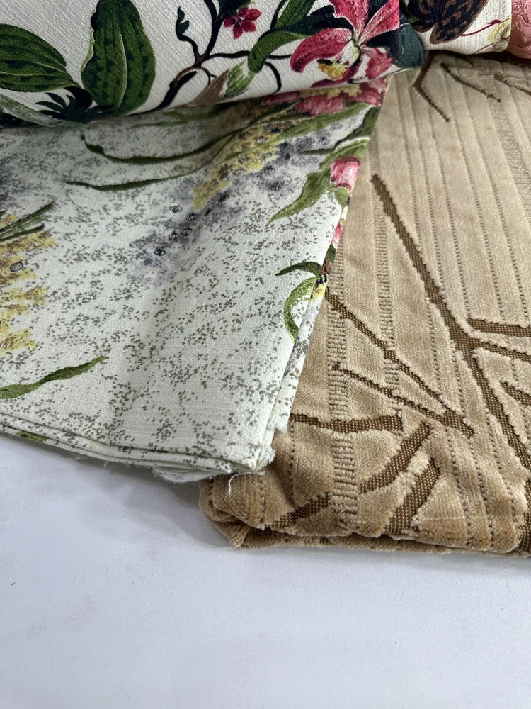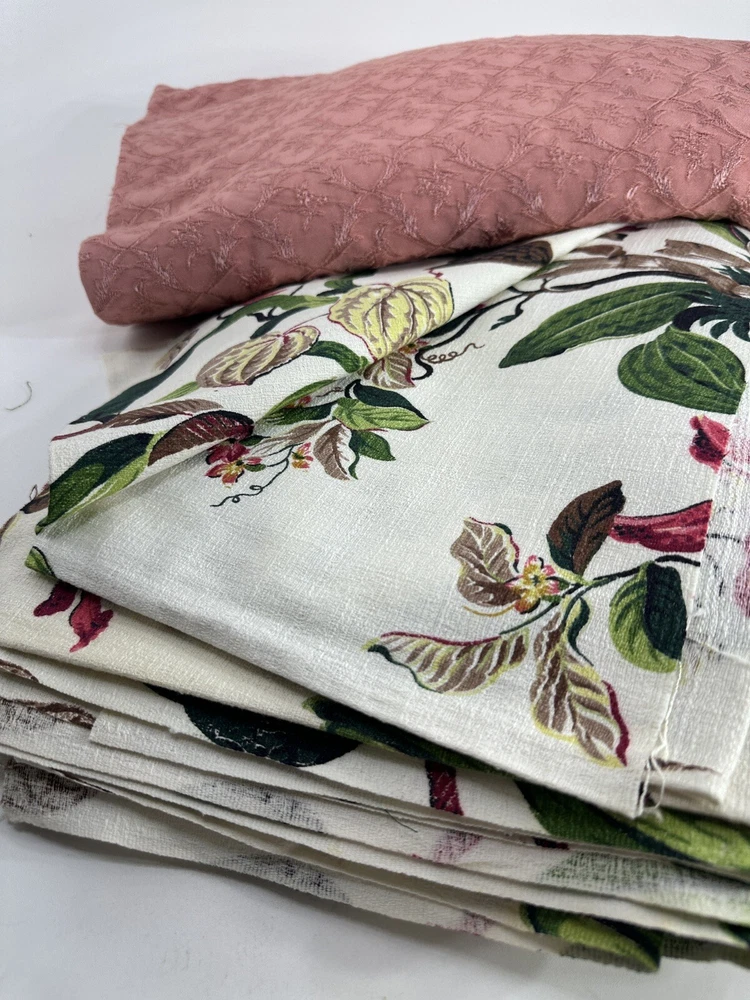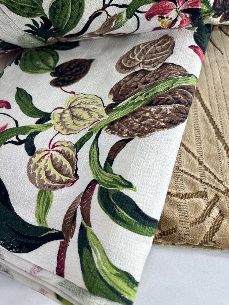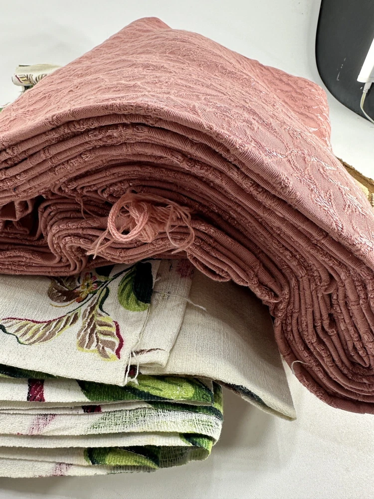 Lot of Mixed Size Material for Crafting Scrapbooking Junk Journal Quilting Etc this is an estate find from a quilter's craft room - was labeled as Curtain Material - Some of it feels a bit like tapestry. The Pink piece seems like a single piece and is quite a lot- the floral piece has been cut up. See photos for details of condition and what all is included.
