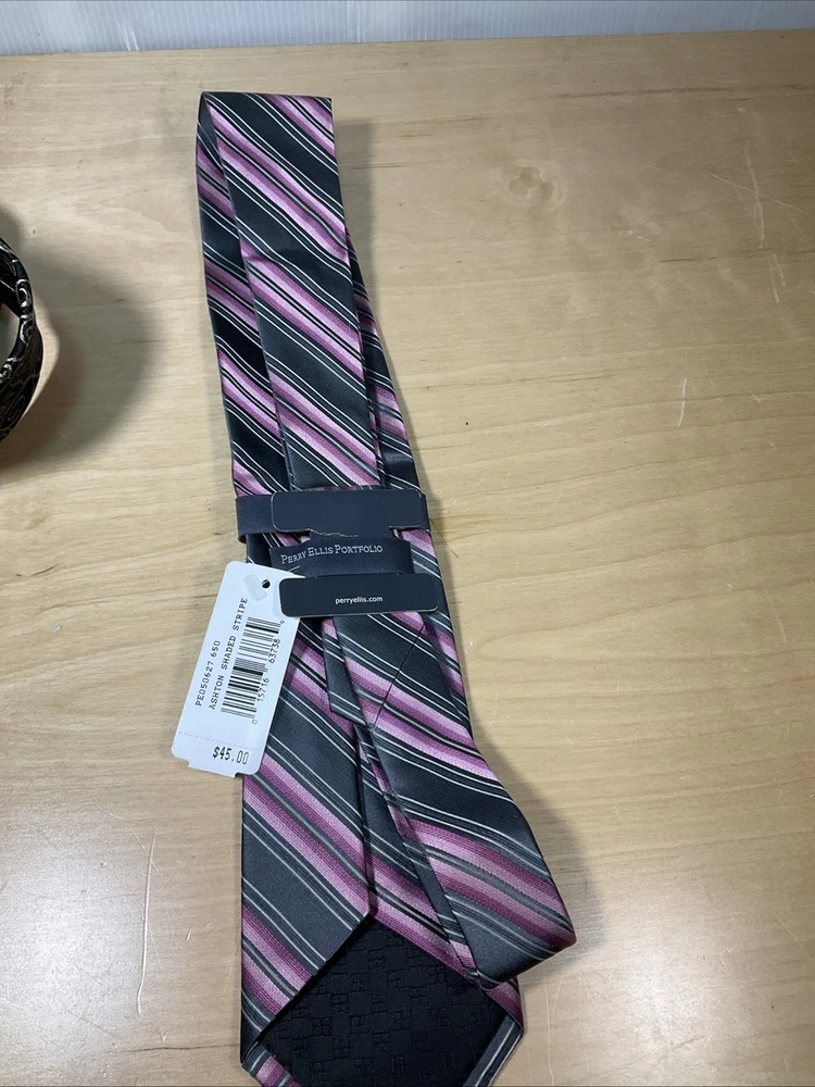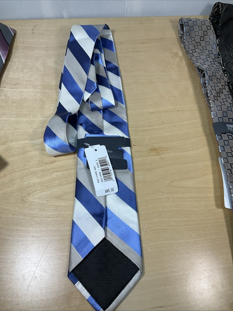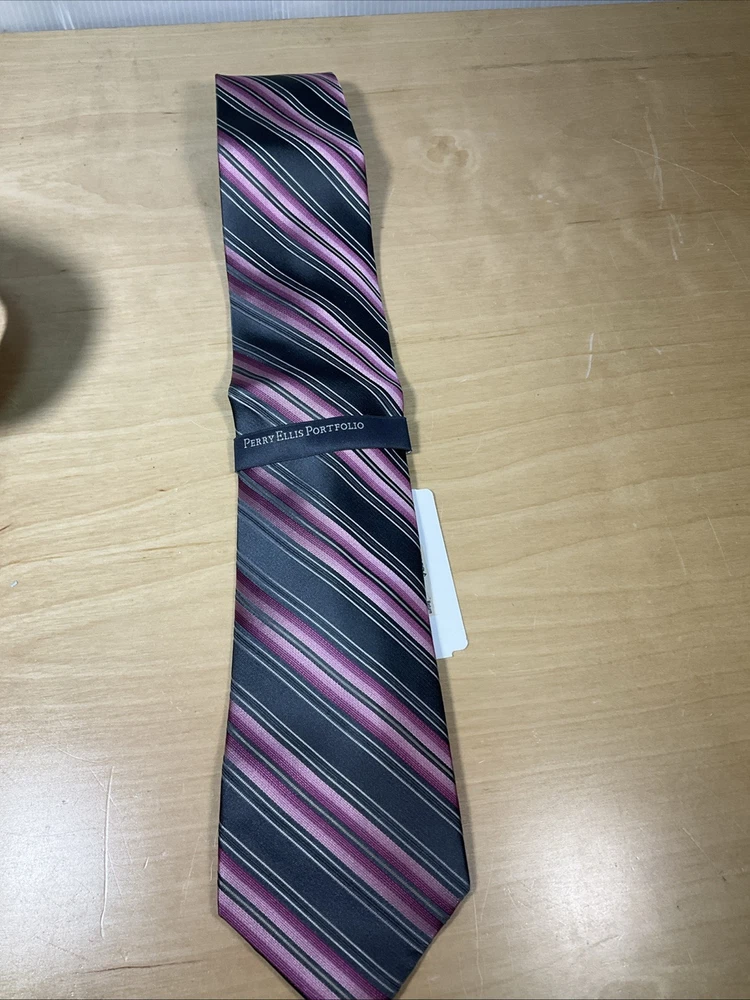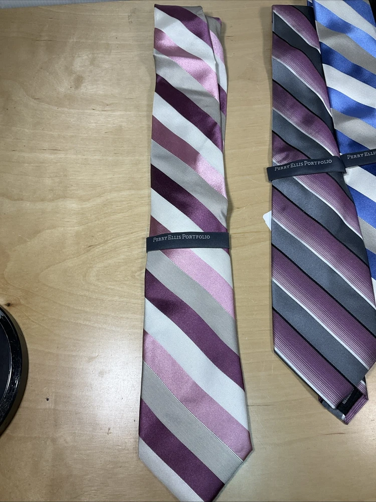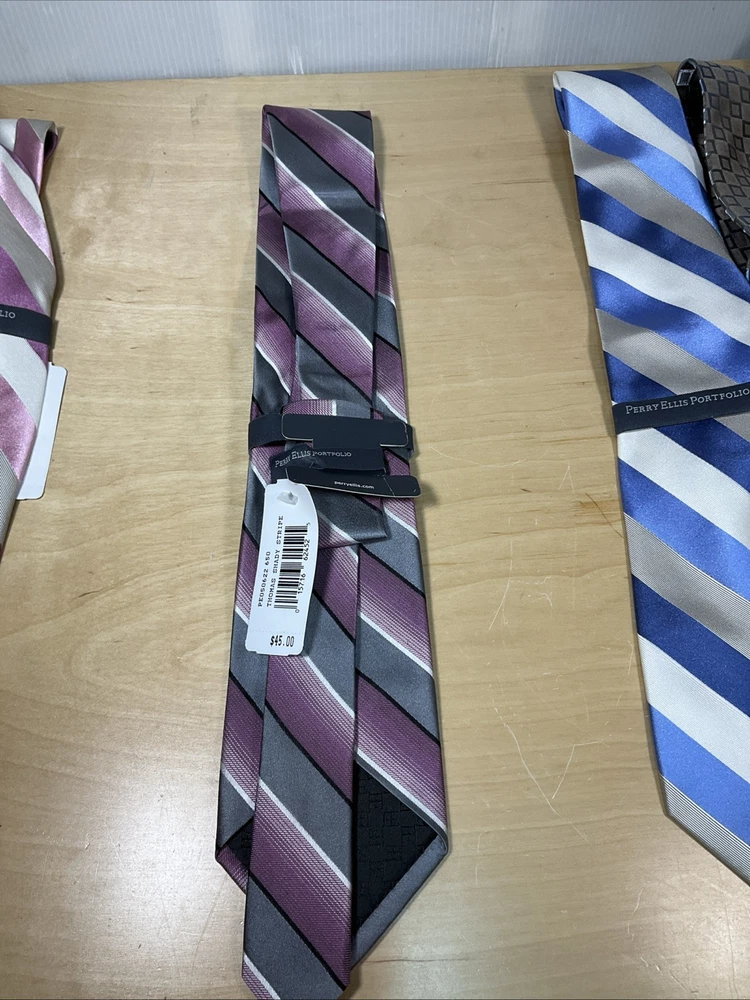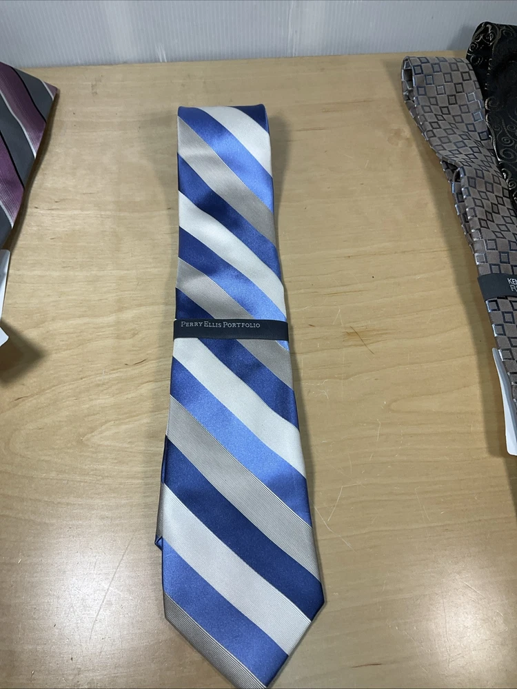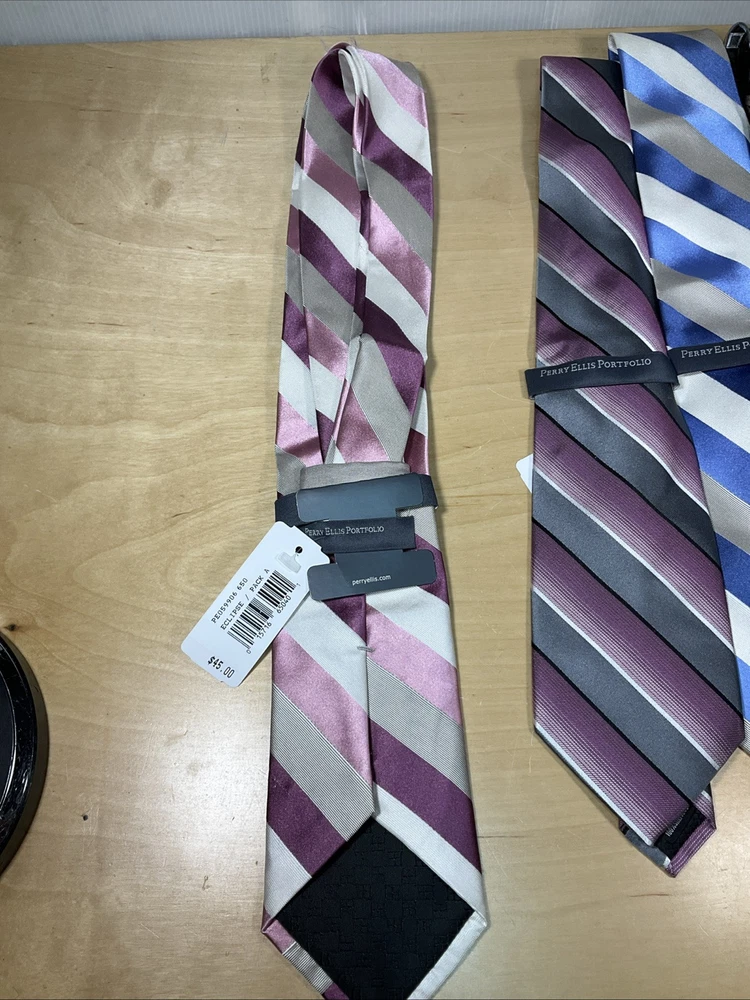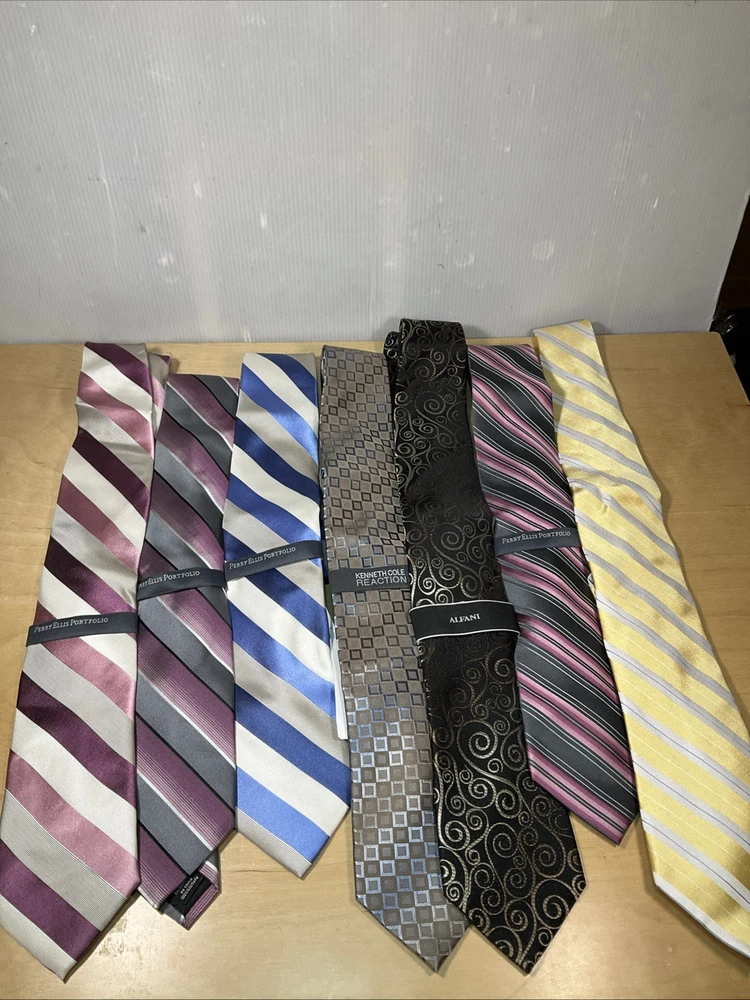 7 New ties with tags. 100% silk ties. 4 Perry Ellis Portfolio, 1 Kenneth Cole Reaction, 1 Alfani and 1 Club Room. No defects or damage. Great variety of colors. Over $300 retail in ties.