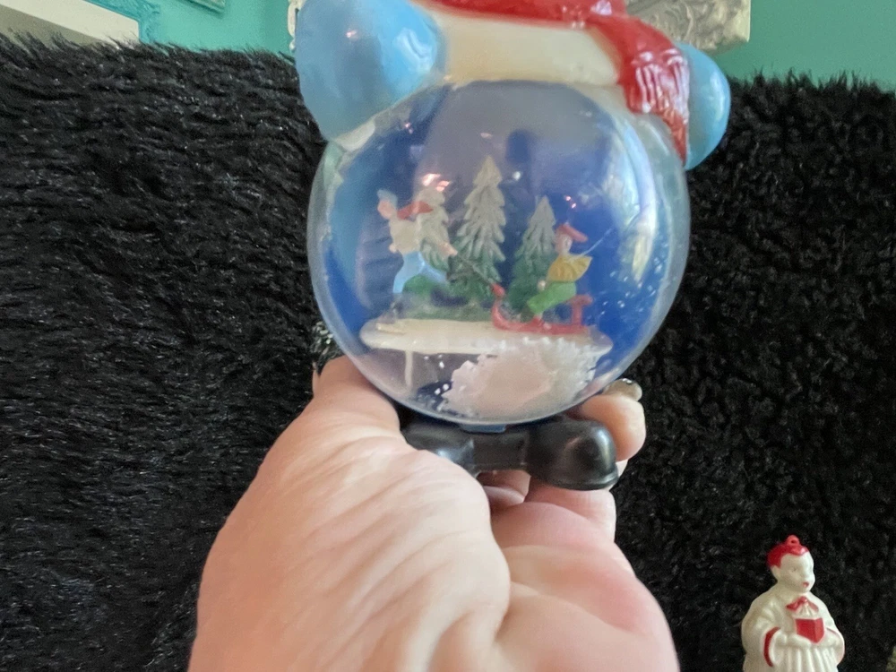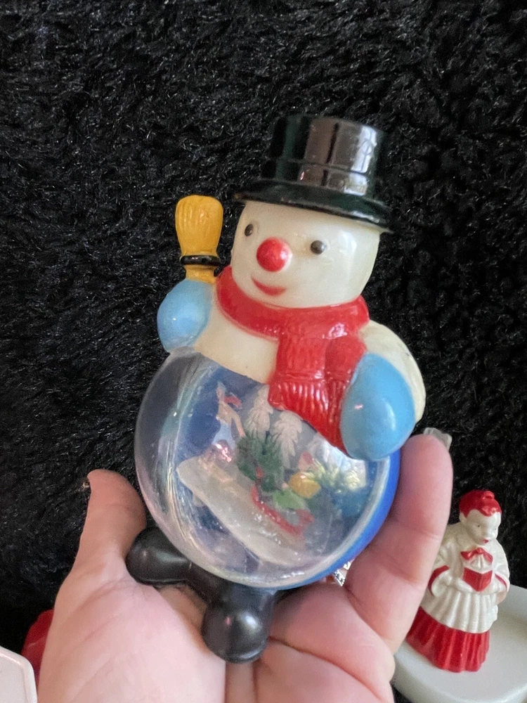 Assorted Lot of Vintage Christmas Hard Plastic Decorations Kitsch Deer Santa Sled Snowman ~Hard plastic Santa open toy pack on his back on sled with one reindeer-all pieces hard plastic. Measures 7 1/2" x 2" x 4". Yellowing of the glue can be seen on the deer. ~There are 2 hard plastic sleds-wear/dirt/slight separation on the back of one. One measures 2 1/4" tall x 4 1/4" x 2" and the other is 2 1/2" tall x 4" x1 3/4". ~4 hard plastic reindeer~ measure 3 1/4" tall x 3" x 1/2". One has a broken side on his antlers/rack. ~White platform with caroler with book and bottle (partial) brush tree measures 5 1/2" x 4" tall x 3". Appox 1" of the top of the bottle brush tree is missing as shown. ~I believe the snowman water globe can be filled with water from the bottom-I did not try to open the clear plug to fill it. Snow is still on the bottom. I can not guarantee it will hold water but I do not see any cracks in the plastic. ~2 4" tall carousel hard plastic ornaments?? with soldiers playing the horn. There are no hooks/clips on the tops of the pieces. Bottoms are marked Hong Kong. ~Weighs 8 oz before a box and packaging. ~I have other lots of vintage ornaments listed for auction this week. Shipping will be combined for multiple purchase. -PLEASE KEEP IN MIND THAT WHEN YOU PURCHASE VINTAGE ITEMS, THEY MAY NOT BE PERFECT AND DEMONSTRATE CHARACTERISTICS OF AGE AND/OR USE. -ITEMS FOUND AT LOCAL ESTATE SALES HERE IN NORTHEASTERN PENNSYLVANIA. -ITEMS ARE SOLD AS FOUND. SOME ITEMS MAY NEED TO BE CLEANED! PLEASE BE SURE TO SEE ALL PHOTOS, AS THEY ARE A VITAL PART OF THE DESCRIPTION!