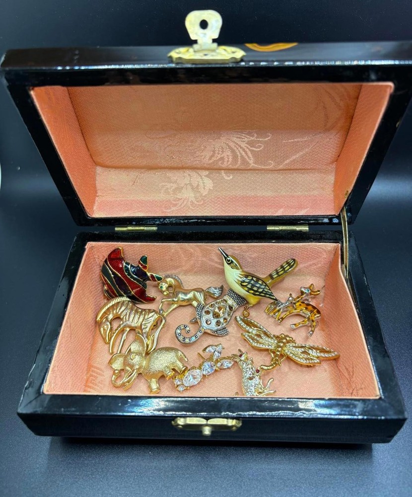 ~ 10 Pins/Brooches and 1 vintage jewelry box ~ All pin mechanisms work as they should This item is vintage or antique and is not new unless otherwise stated. Normal age-related wear may be present, including light surface wear, scratches, tarnish, patina, oxidation, or minor imperfections consistent with age and prior use. Patina and wear are part of the character of vintage jewelry and are not considered defects. Please review all photos carefully, as they are part of the description and best represent the item’s condition and details. Additional photos or information are available upon request prior to purchase. Please feel free to message me with any questions or concerns, Thank you!