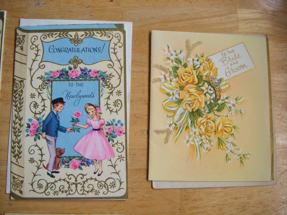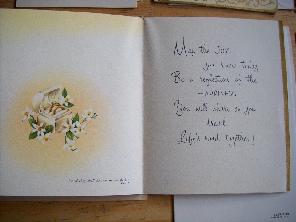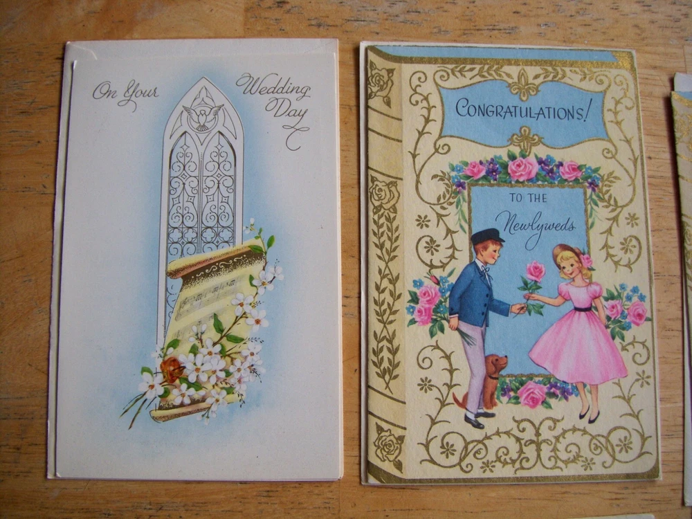 Cards measure between 5 1/2" - 6 1/2" high x 4 1/8" - 4 1/2" wide. Three cards have no Manufacturer name. The other three are from religious organizations. One card has a 1955 date on the back. The remainder are also from the same time frame.