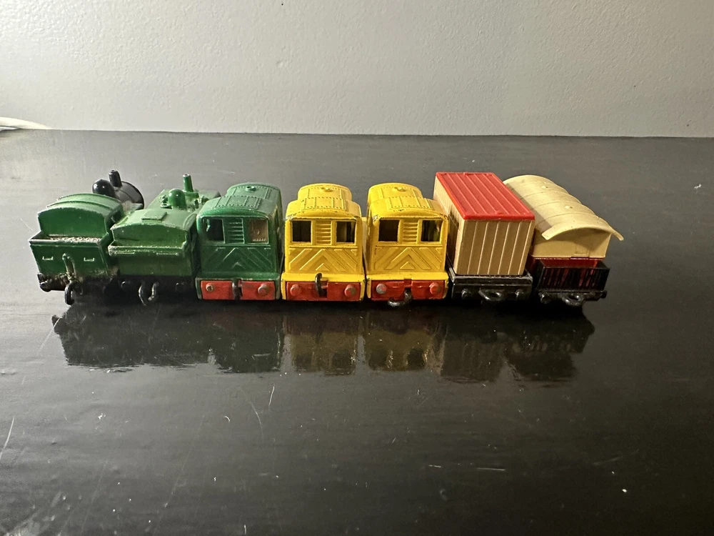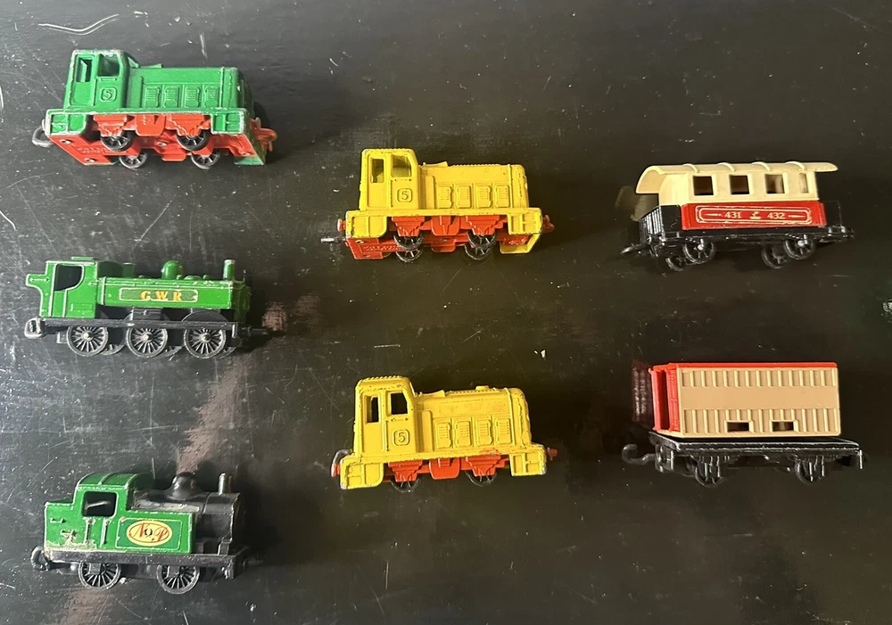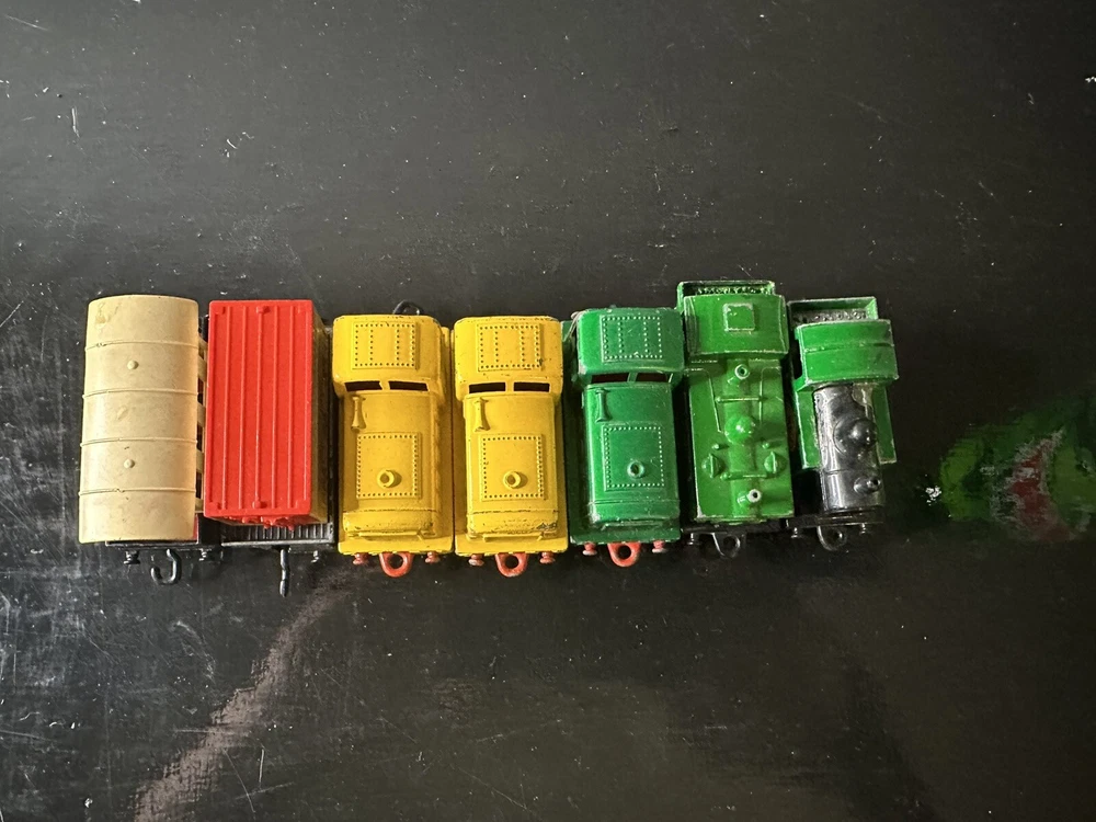 The product is a lot of 7 vintage train cars made by Matchbox. These toy cars are from the brand Matchbox and are designed in the shape of train cars. They fall under the category of diecast and toy vehicles, specifically cars. Perfect for collectors or enthusiasts of vintage toys, this lot offers a variety of train cars that hold nostalgic value for those interested in vintage manufacture items from Matchbox.