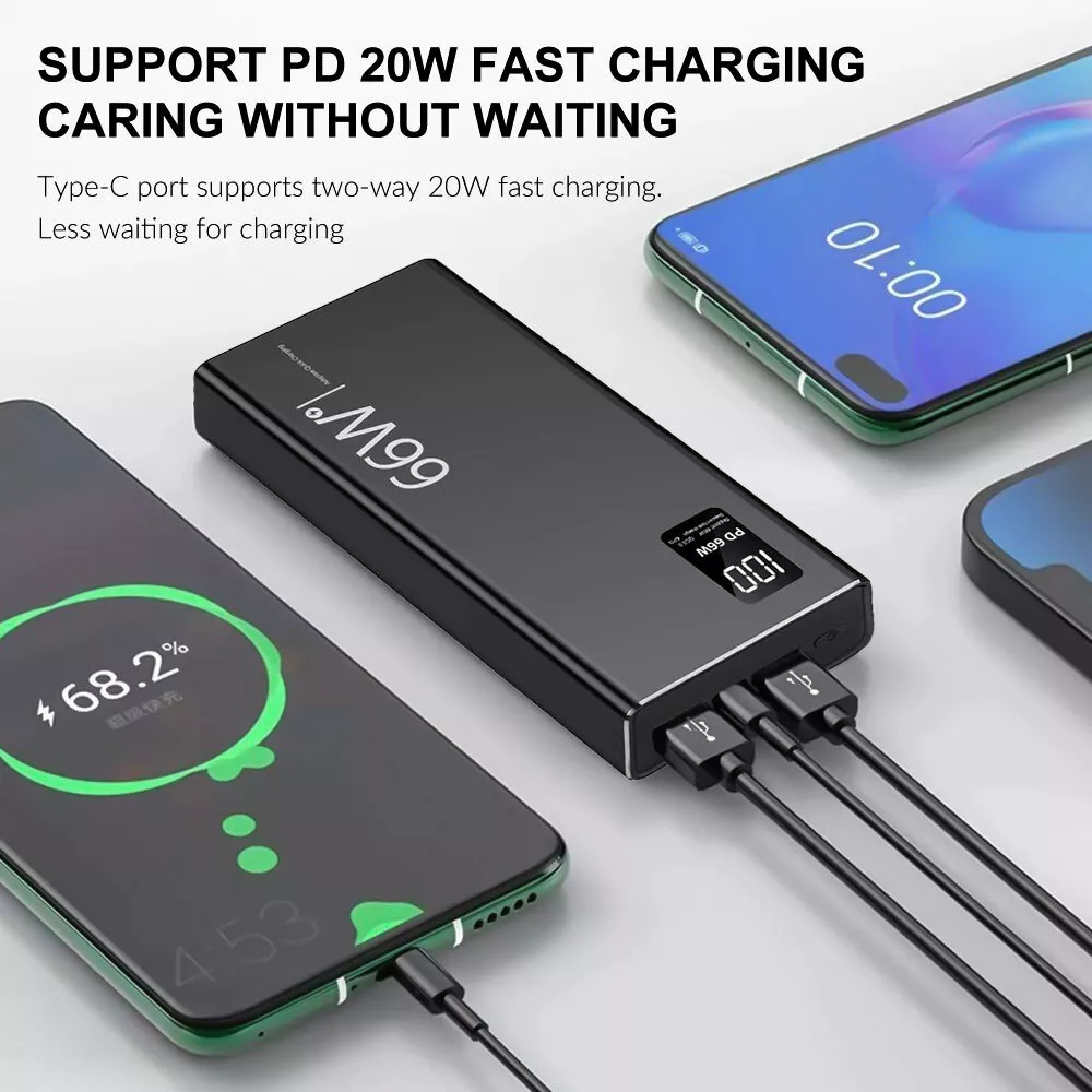 Specification: Item: 66W Super Fast Charge Power Bank Capacity: 30000mAh Input: Micro USB input: 5V/2A Type C Input: PD20W Output: USB Output: 22.5W Type C Output: PD20W Total power: 66W power bank Material:ABS Plastic Color: Black Feature: Support Fast Charge Support PD 20W Two-Way Fast Charging Support PD 3.0 Fast Charging Support Type C Input and Output With LED Digital Display Package Included: 1x Power Bank 1x USB Cable 1x User Manual