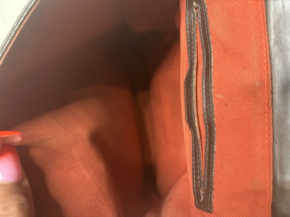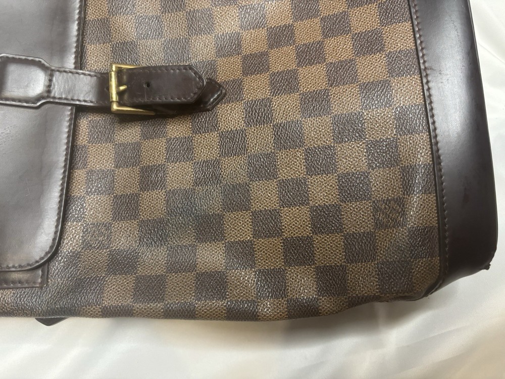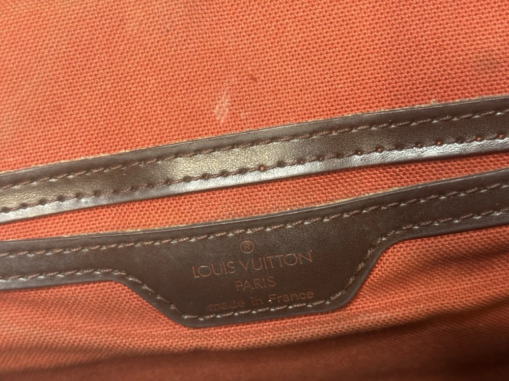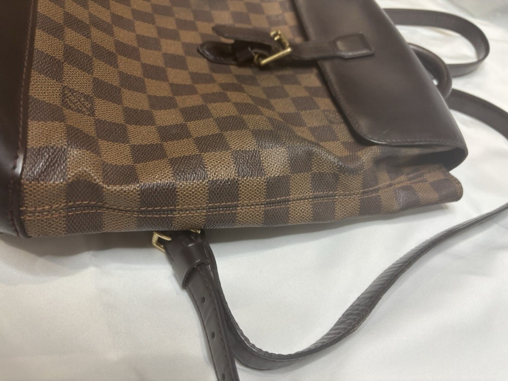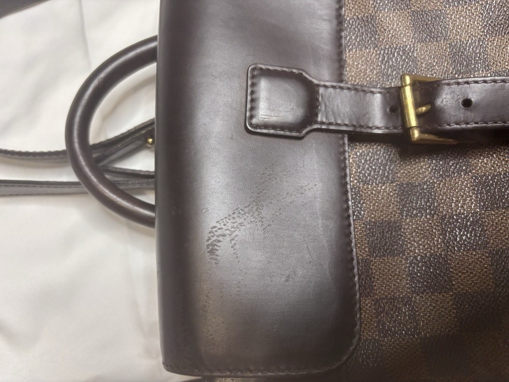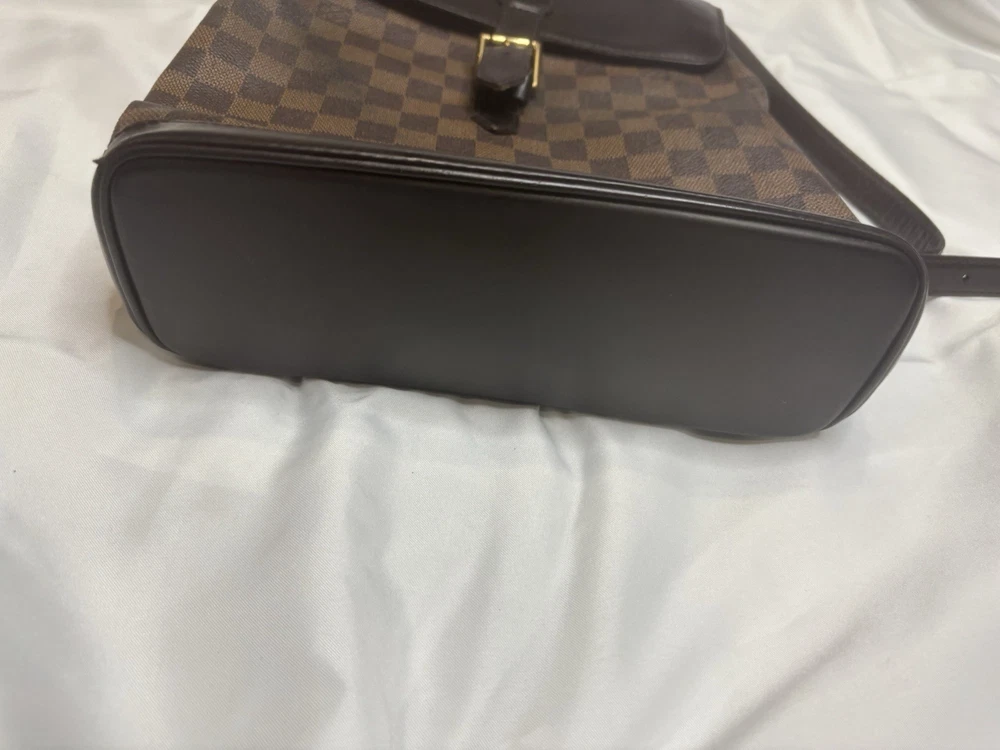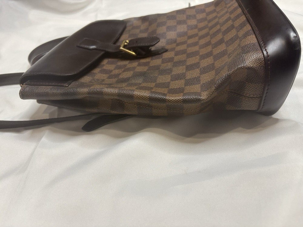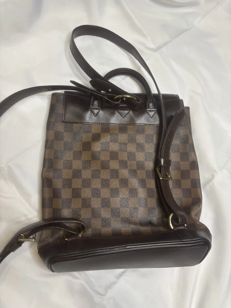 Louis Vuitton Damier Ebene Coated Canvas Soho Backpack Add a touch of vintage elegance to your wardrobe with this authentic Louis Vuitton Soho Backpack in the timeless Damier Ebene canvas. This sophisticated and structured backpack features smooth dark brown leather trim, a buckle flap closure, and gold-tone brass hardware. A favorite among collectors for its clean lines and refined finish. Details: • Style: Soho Backpack • Canvas: Damier Ebene • Trim: Dark brown leather • Hardware: Gold-tone brass • Interior: Red canvas lining with slip pocket • Adjustable shoulder straps • Made in France Measurements (approx.): • Height: 12” • Width: 10” • Depth: 4.5” • Strap Drop: Adjustable Condition: This bag is in very good pre-owned condition. The canvas is clean. Some minor fading in areas.Light scuffs are visible on the flap and base (see photos), and the hardware shows gentle aging. The interior is fairly clean .All straps are secure and functional.