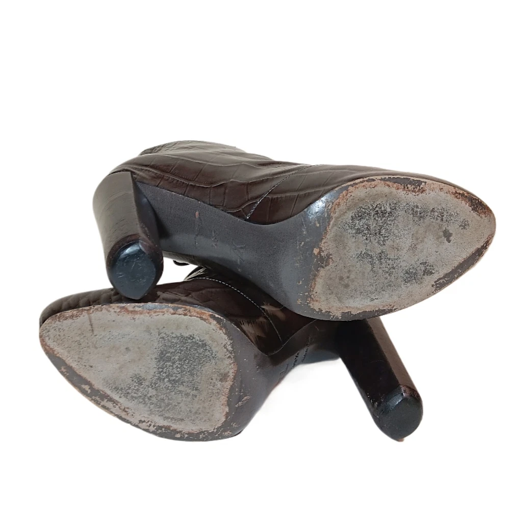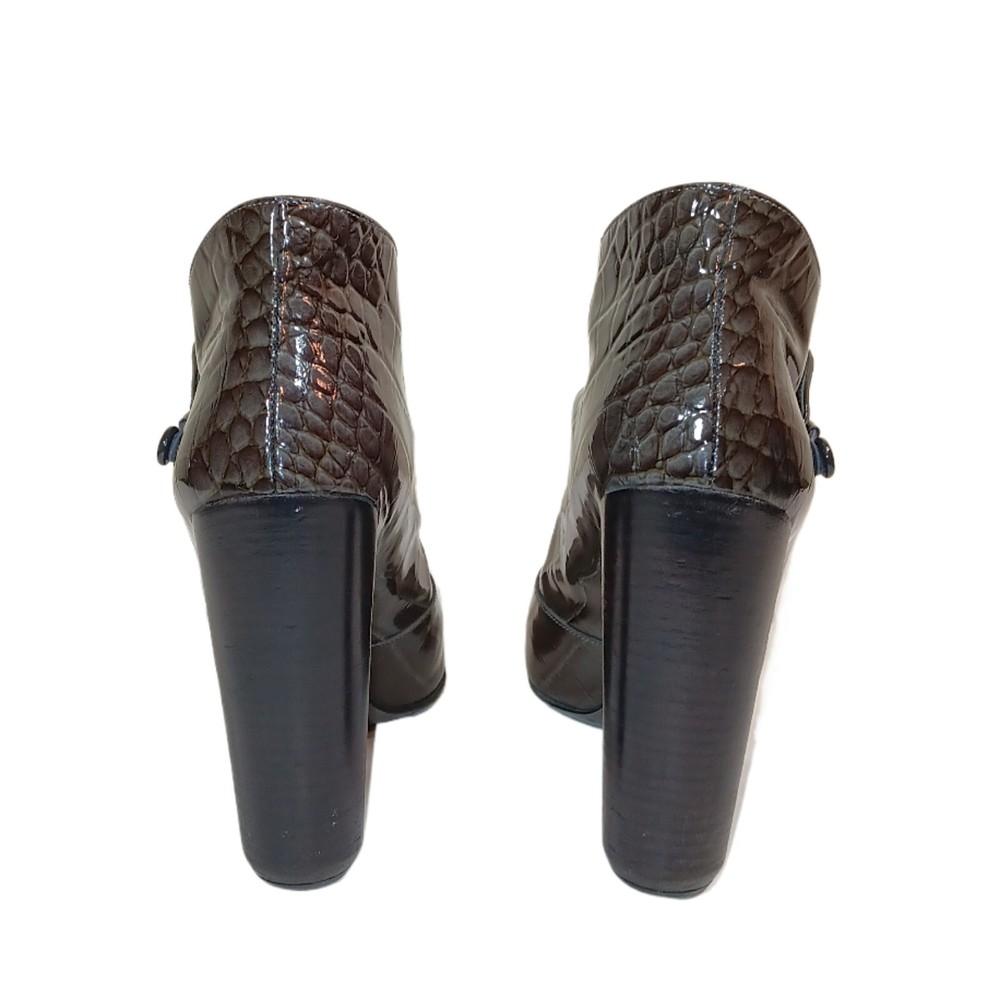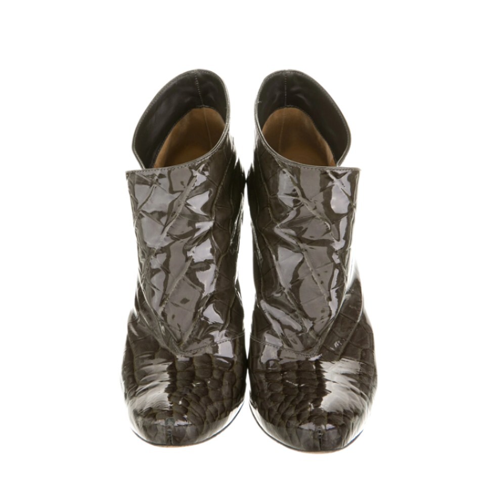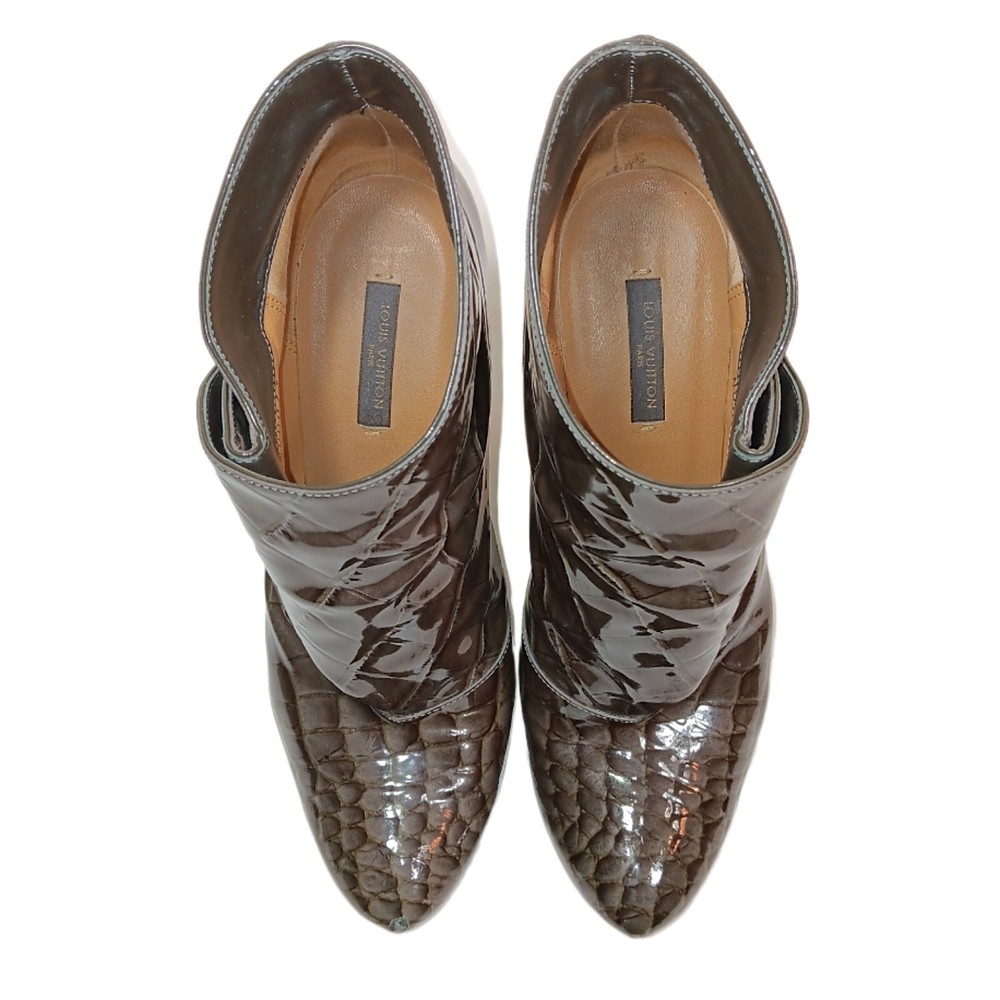 Color: Olive green Brand: Louis Vuitton Size: US 9.5M, EU 39.5 Embossed patent leather upper Almond toe Beautiful dark green almost gray color Side button closure Lightly cushioned footbed Heel height: 4.5 inch round block heel Expert authentication Style: Ankle bootie C ondition: Very good Authenticated Louis Vuitton ankle boots in very good condition with heavy wear on the soles.