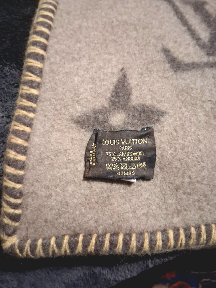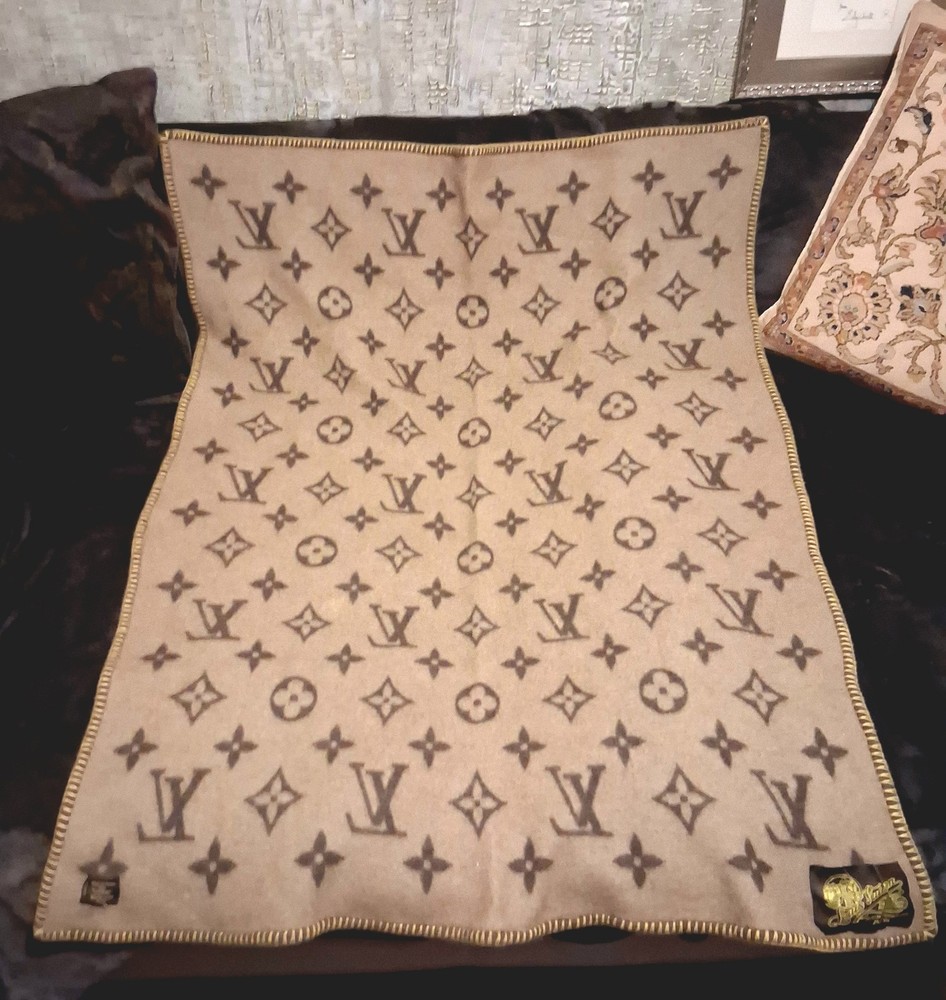 Louis Vuitton Blanket crafted from a blend of luxurious Lambswool and Angora materials, adorned with the iconic Monogram pattern. This cozy blanket measures 52.4 inches x 61.0 inches, making it ideal for adding a touch of elegance to your bedroom decor. Gently used smoke free, no stains or damage