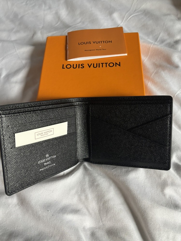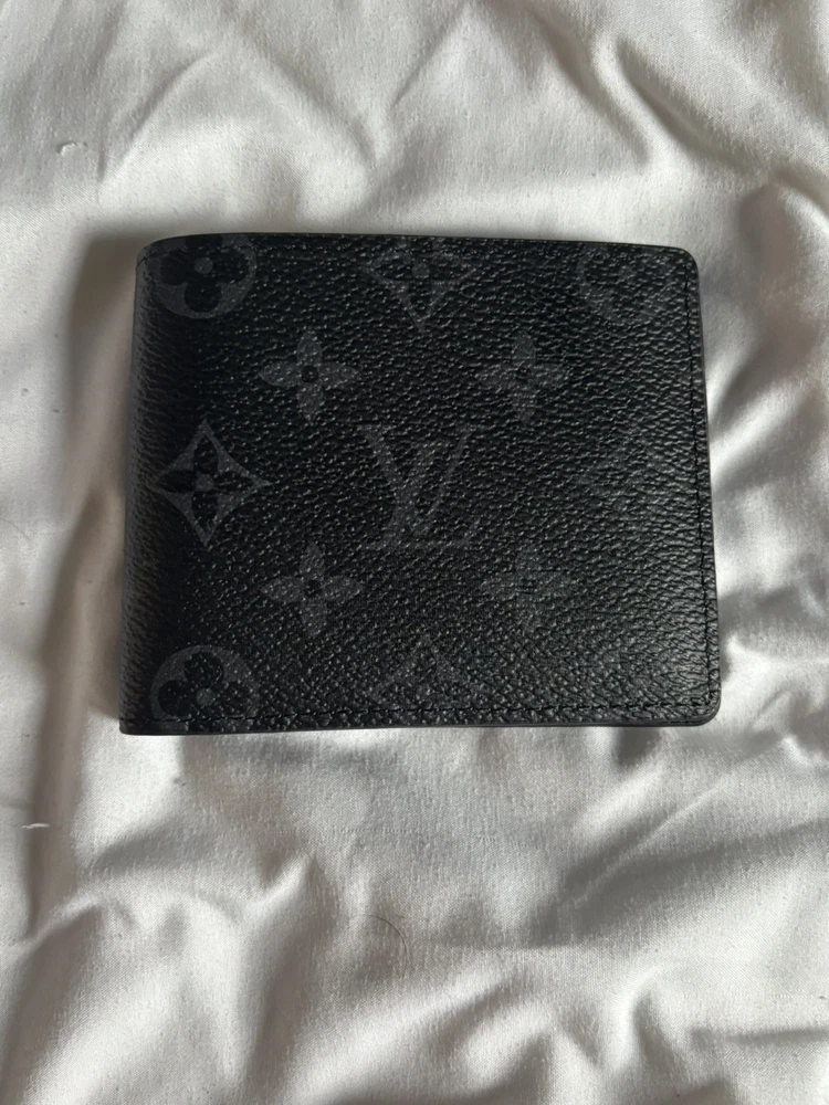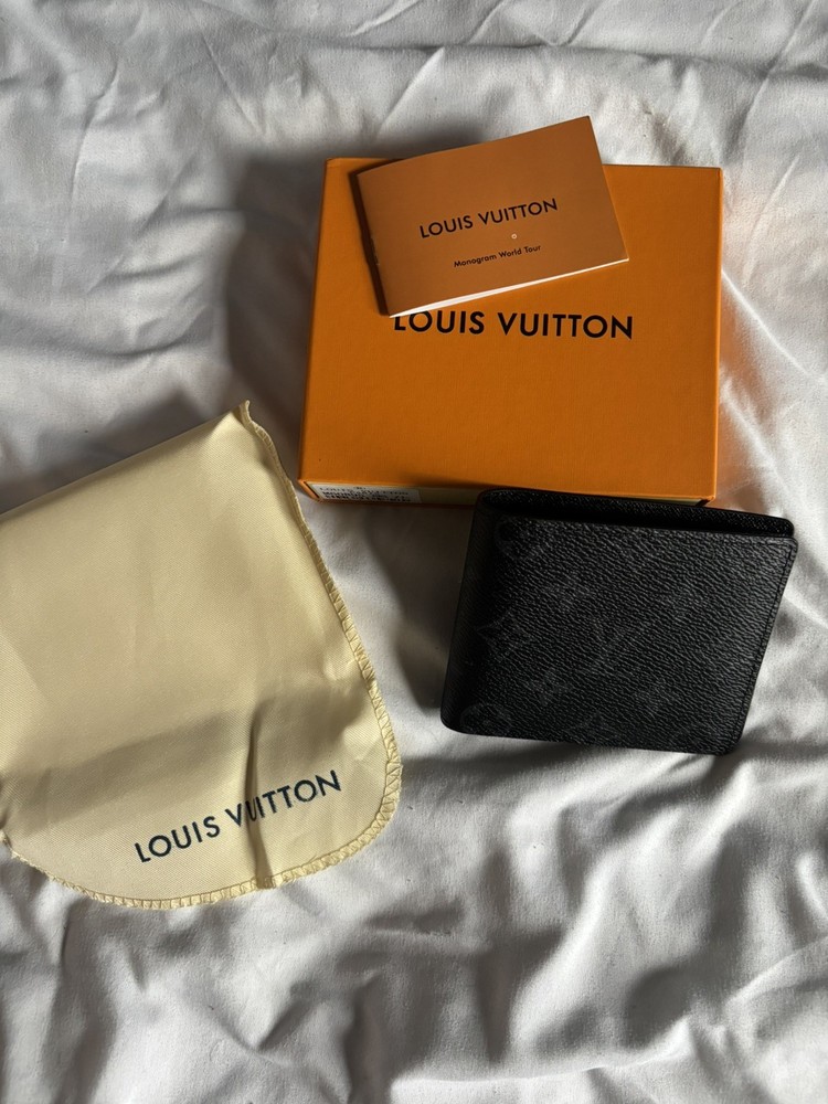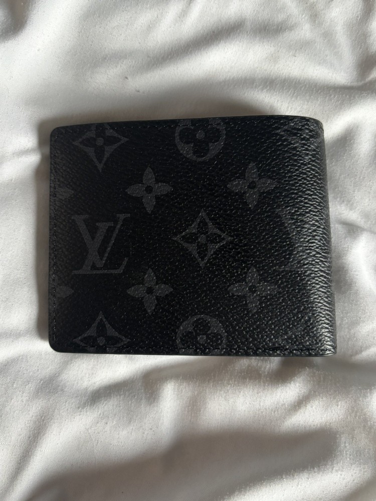 The Louis Vuitton Monogram Eclipse Canvas Wallet Card Holder is a stylish and sophisticated accessory designed for men. Made from black leather with the classic Louis Vuitton logo accents, this wallet features multiple credit card slots for organization and style. This sleek and versatile piece is perfect for any man looking to add a touch of luxury to their everyday essentials.