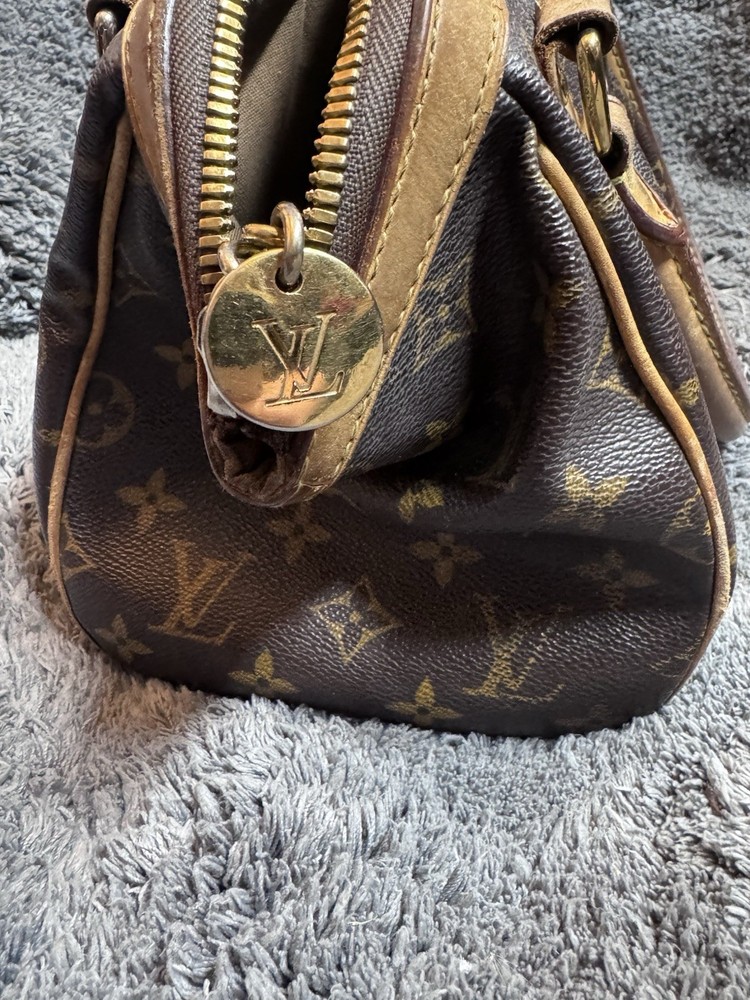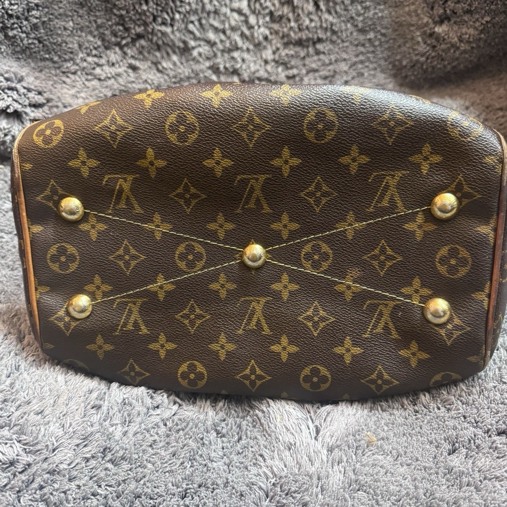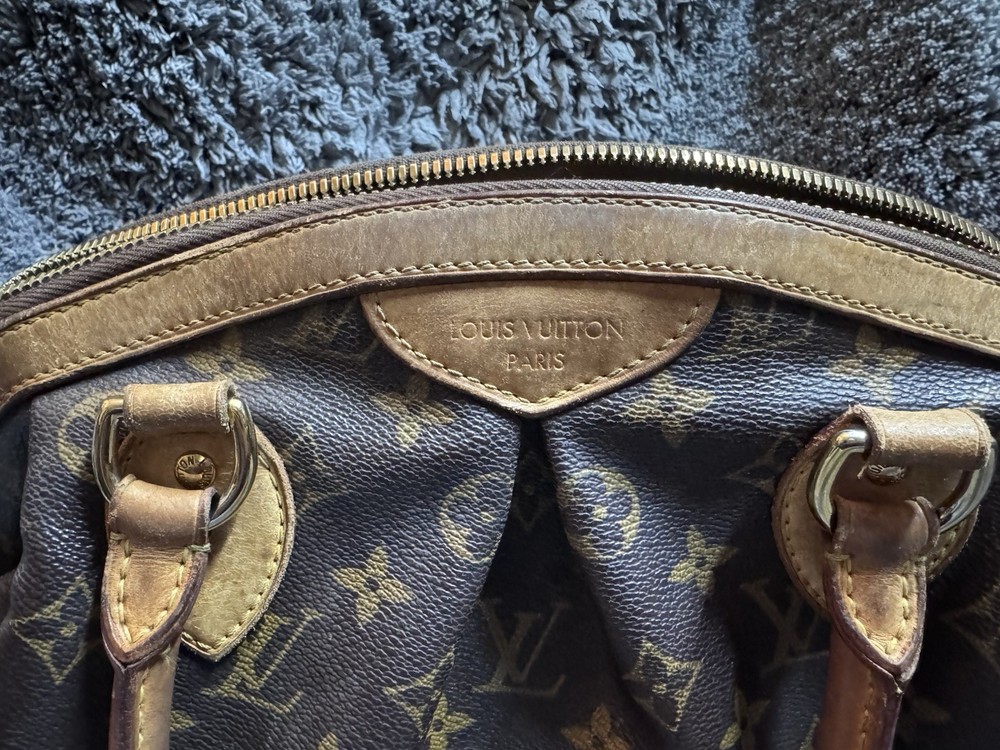 The Louis Vuitton Tivoli Tote GM in Brown Canvas Monogram is a stylish and luxurious handbag designed for women. With a classic monogram pattern and gold hardware accents, this tote features a brown leather handle/strap and a zip closure. The coated canvas exterior is combined with a microfiber lining, making it a durable and versatile accessory for everyday use. The spacious size and comfortable strap drop make it a practical and chic choice for any outfit, showcasing the iconic Louis Vuitton Tivoli product line.