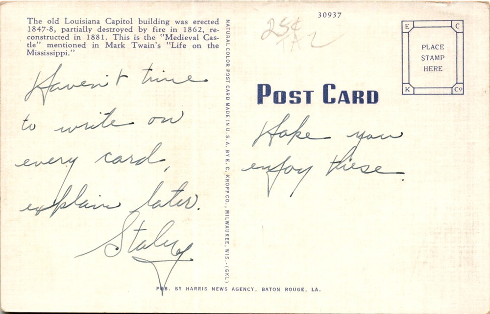 MAKE AN OFFER. THE MORE YOU BUY THE BETTER DEAL I WILL ACCEPT The postcard features a black and white image of the Louisiana State Capitol in Baton Rouge. The text on the back provides historical information about the old Louisiana Capitol building, which was constructed in 1847-1848, partially destroyed by fire in 1862, and reconstructed in 1881.