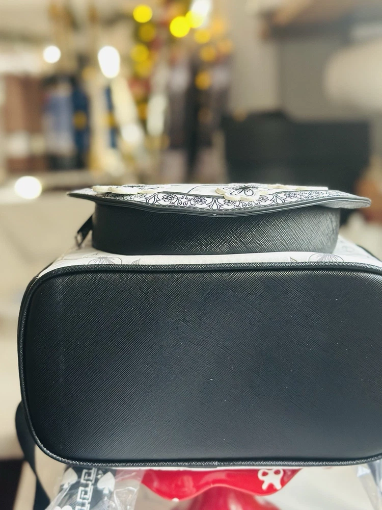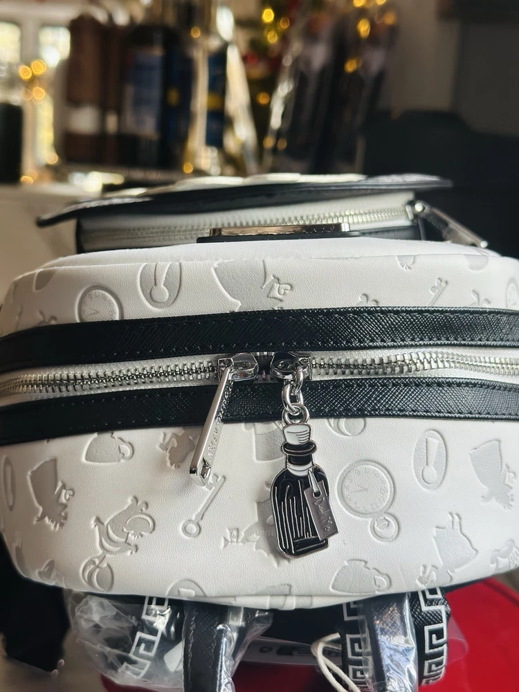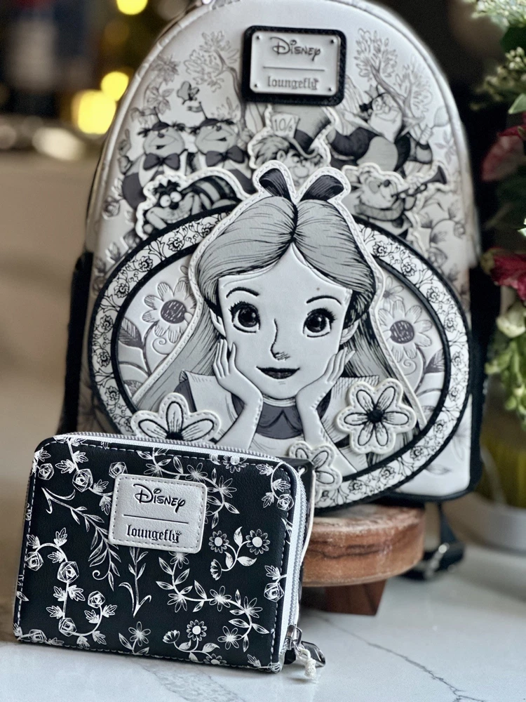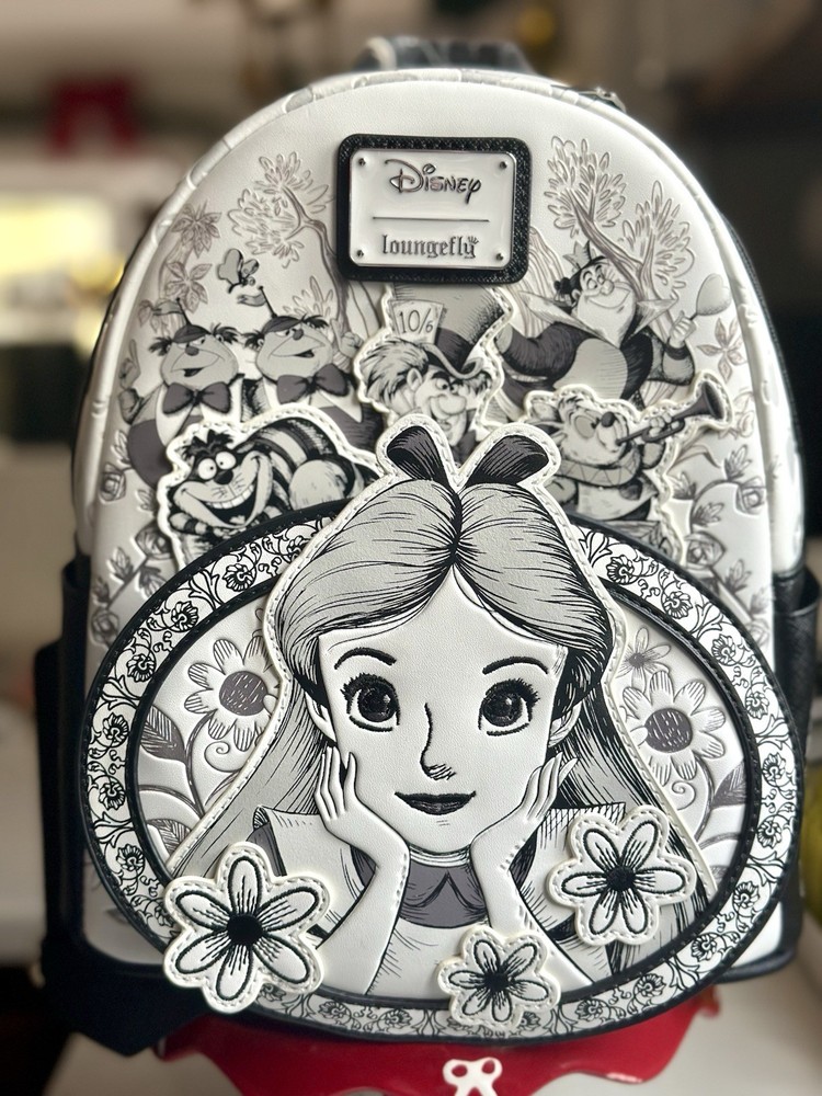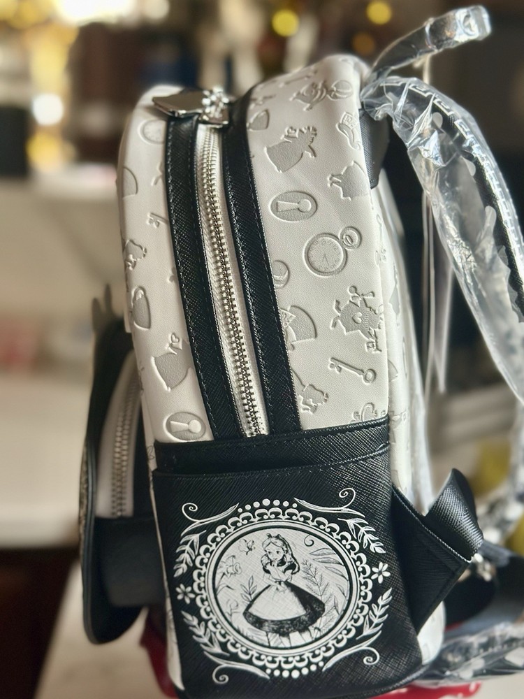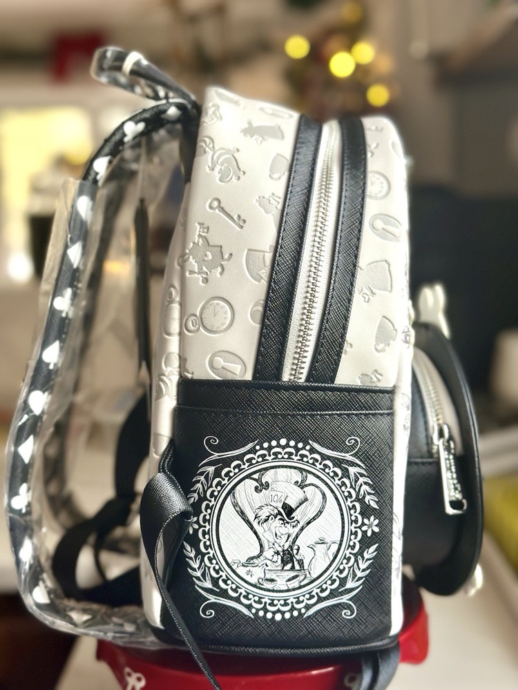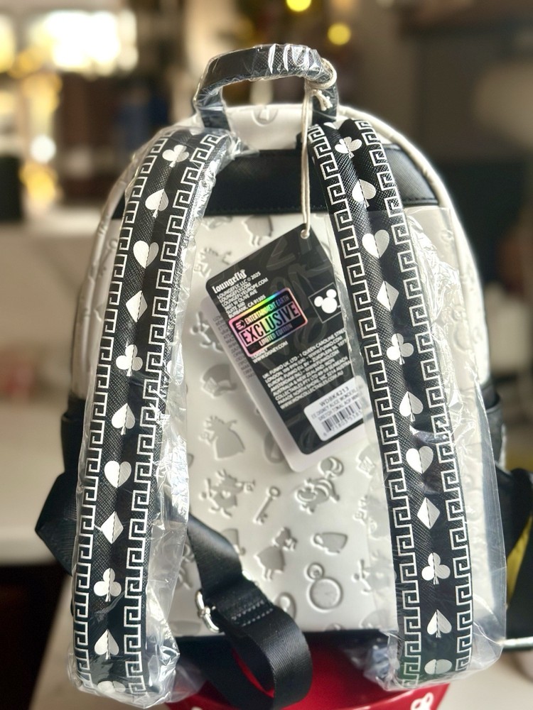 Sold out exclusive This sketch styled mini-backpack features Alice front and center as an applique surrounded by floral appliques and details. Also featured are some of her Wonderland friends like the Mad Hatter, White Rabbit, Cheshire Cat, Tweedledee, Tweedledum, and the Queen of Hearts! The entire mini-backpack is debossed with different symbols from the movie and the straps are covered with card suits symbols. This faux leather mini-backpack features a sturdy top handle, adjustable shoulder straps, side drop pockets, a front zipper pocket, a metal zipper charm, appliques, debossed, embroidered and printed details with a coordinating interior lining! It measures approximately 10 1/2-inches tall x 9-inches wide x 5 1/2-inches deep. This limited edition mini-backpack would look wonderful in your Disney collection, claim yours before it vanishes like the Cheshire Cat!