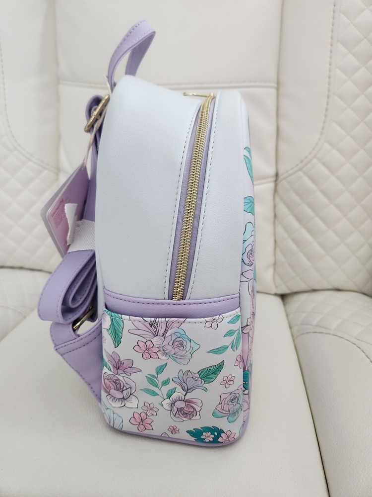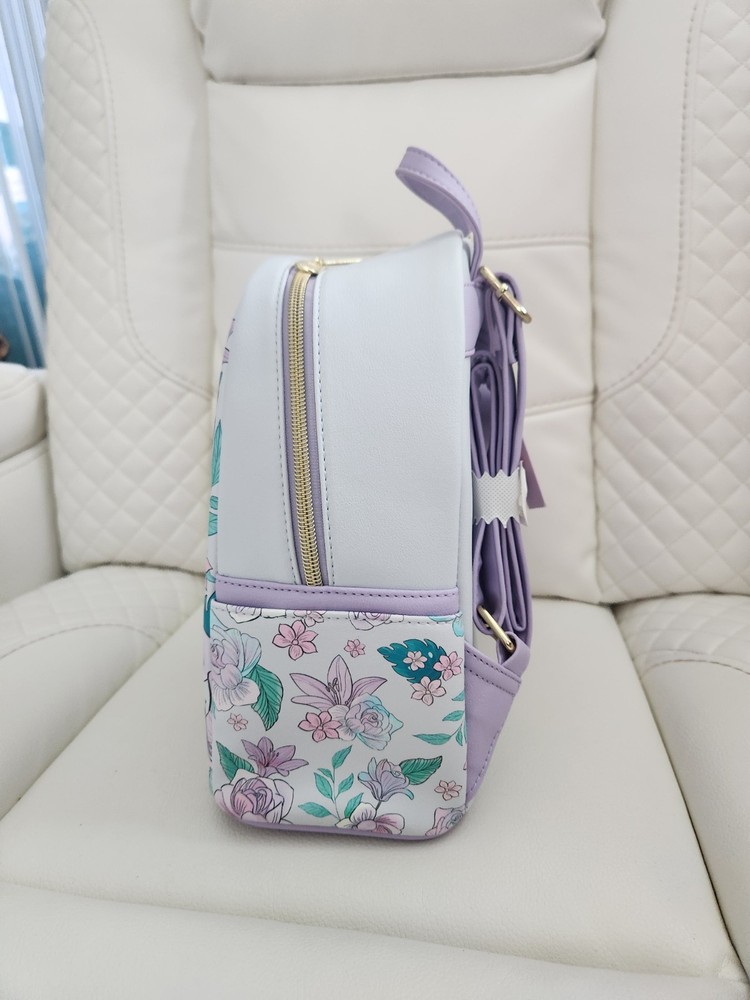 Feel the flower power with this mini backpack inspired by the Aladdin character, Jasmine! The backpack is lavender and shows Jasmine posed in the center of a soft flower motif that extends to the side pockets. There is an interior drop pocket and adjustable straps. 9 1/2" x 4" x 10 1/2" Polyurethane